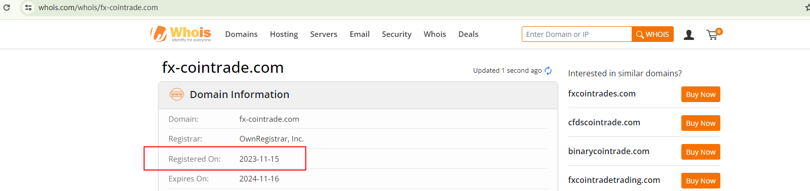 The domain name of FX COINTRADE was recently registered in November 2023, a fact that contradicts to the alleged business scale. This is a red flag.