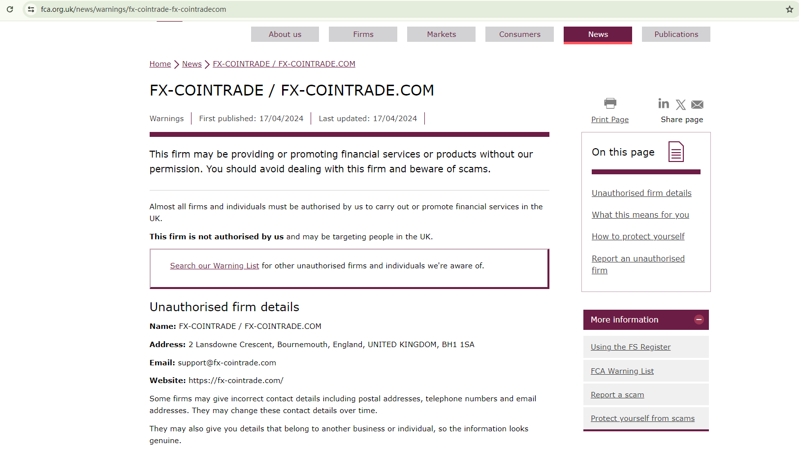 While the firm claims to be located in the UK, there are no indications that it is authorized by the Financial Conduct Authority (FCA). As such, the FCA issued a warning against FX COINTRADE, identifying it as an unauthorized firm in the country and advising investors to stay away from the scam.