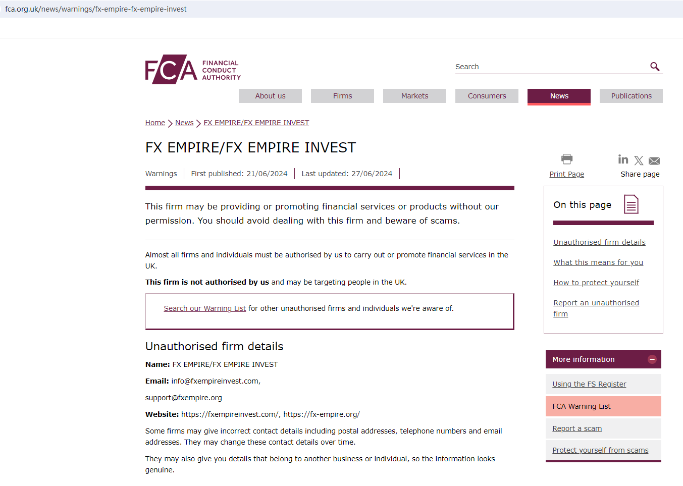 On 27 Jun, 2024, the Financial Conduct Authority (FCA) issued a warning against FX EMPIRE (aka FX EMPIRE INVEST), believing this company might be providing financial services or products without proper authorization in the UK. https://www.fca.org.uk/news/warnings/fx-empire-fx-empire-invest