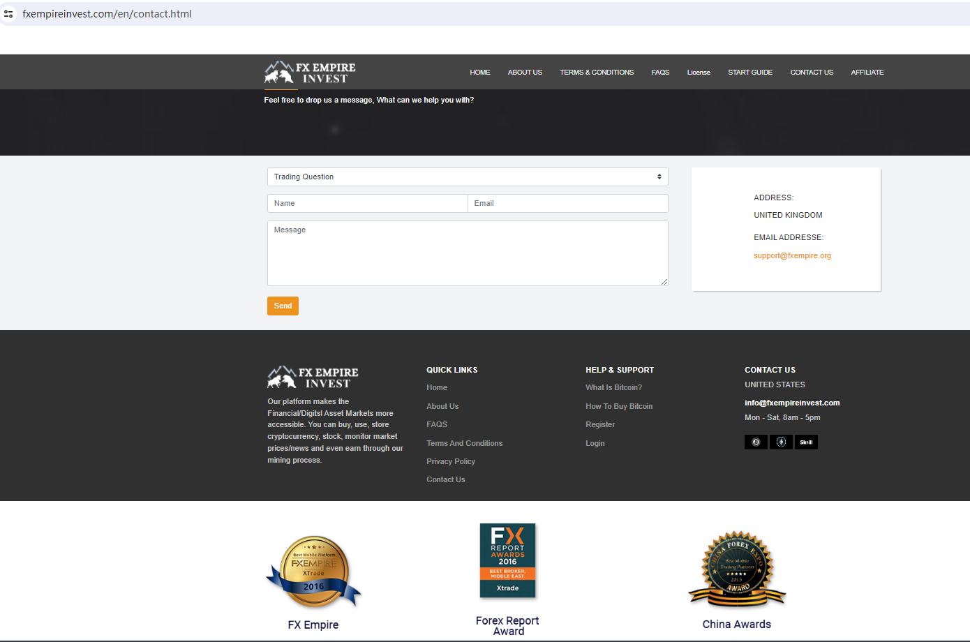 According to its website, it is located in the UK. Upon investigation, we found that the Financial Conduct Authority (FCA) issued a warning against FX EMPIRE (aka FX EMPIRE INVEST), believing this company might be providing financial services or products without proper authorization in the UK.