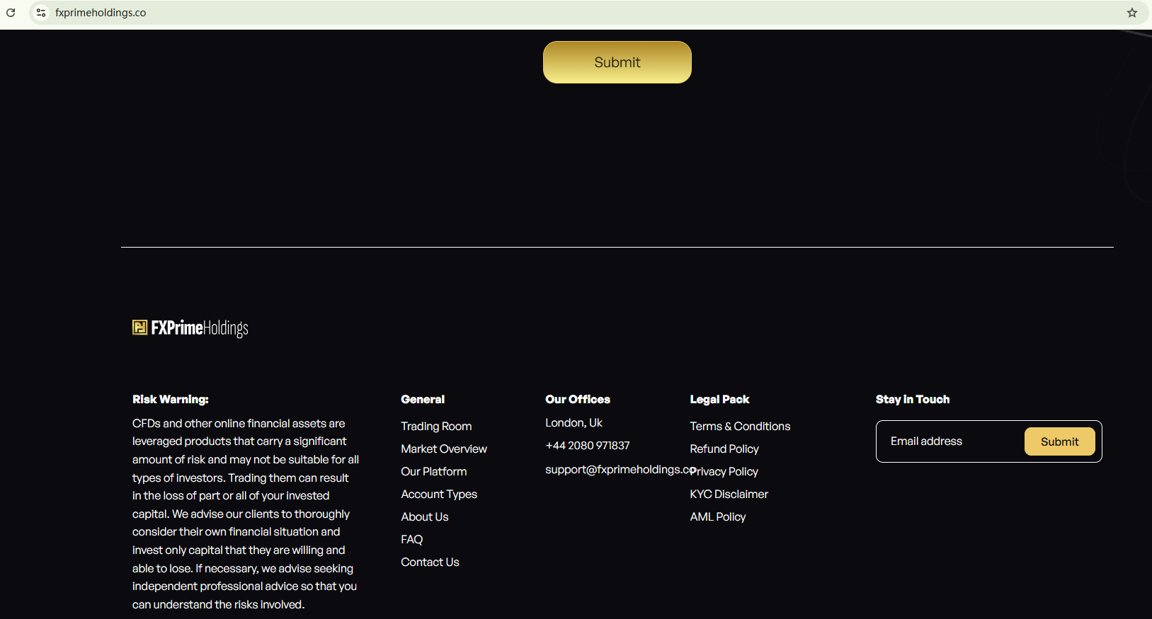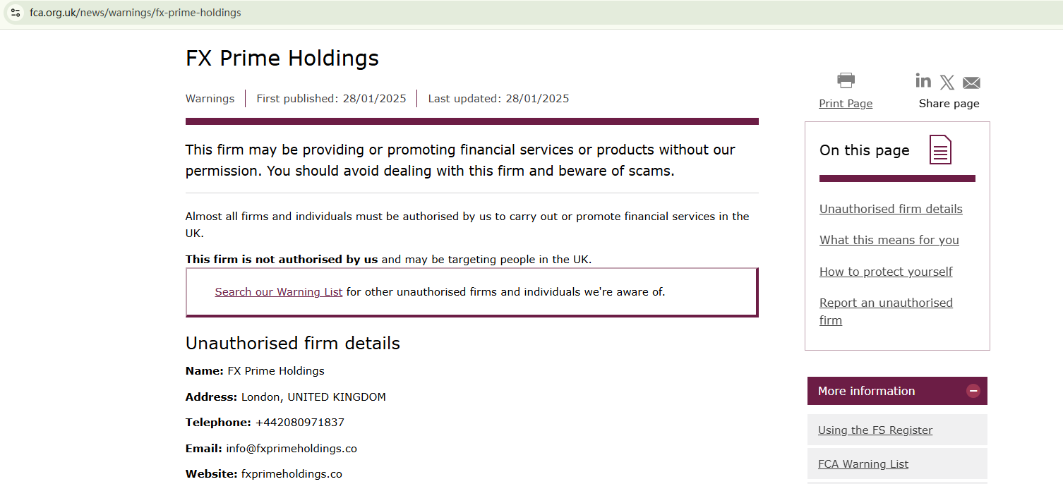 FX Prime Holdings' website resembles those of fraudulent platforms, using a generic website template. Almost all the content and design elements are derived from the template, not truly reflecting their business. This helps create the illusion of professionalism to deceive unwitting investors. The website fails to disclose any useful information to prove its legitimacy and credibility. While FX Prime Holdings claims to be domiciled in the UK, the Financial Conduct Authority (FCA) has issued a warning against the entity for being unauthorized.