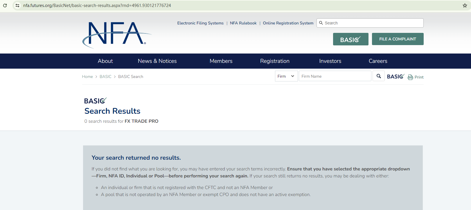 While Fx Trade Pro claims to be domiciled in the US, there are no indications that it is registered as a member of the National Futures Association (NFA). This means it is not subject to the NFA's oversight.