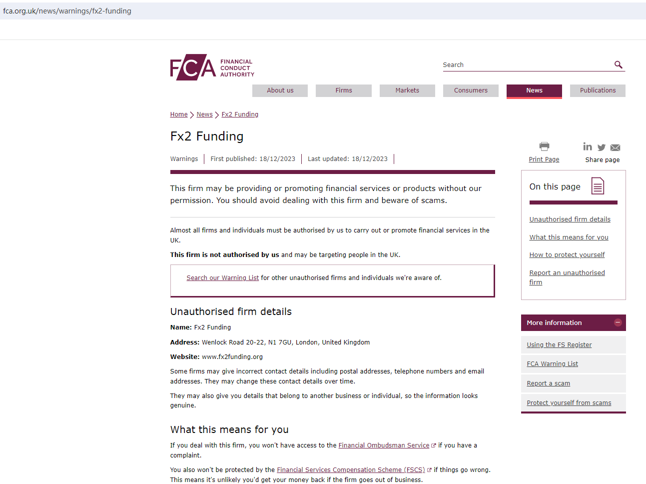 In addition, it is located in the UK, however, we found that the United Kingdom Financial Conduct Authority (UK FCA) issued a warning that Fx2 Funding was providing financial services or products in the UK without authorisation.
