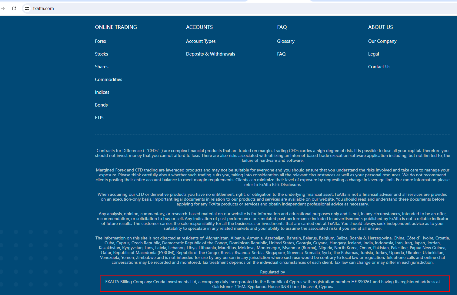 FXAlta mentioned Ceuda Investments Ltd claiming to be registered in Cyprus. However, our investigation suggests that Ceuda Investments Ltd are not in the registries of the Cyprus Securities and Exchange Commission (CySEC). As such, FXAlta is misrepresenting regulatory status to deceive unsuspecting investors.