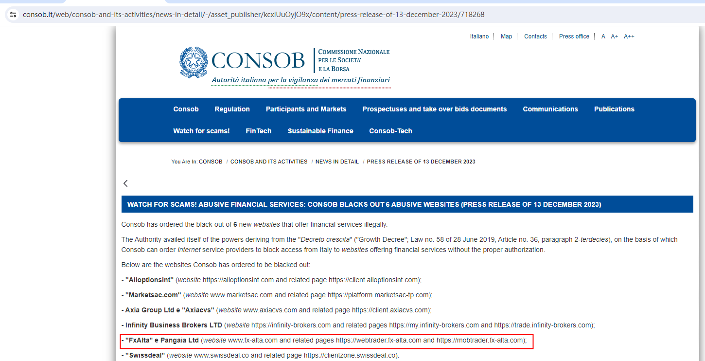 In addition, the Italian Companies and Exchange Commission (CONSOB) has ordered this broker's website to be blacked out since it offers financial services illegally.
