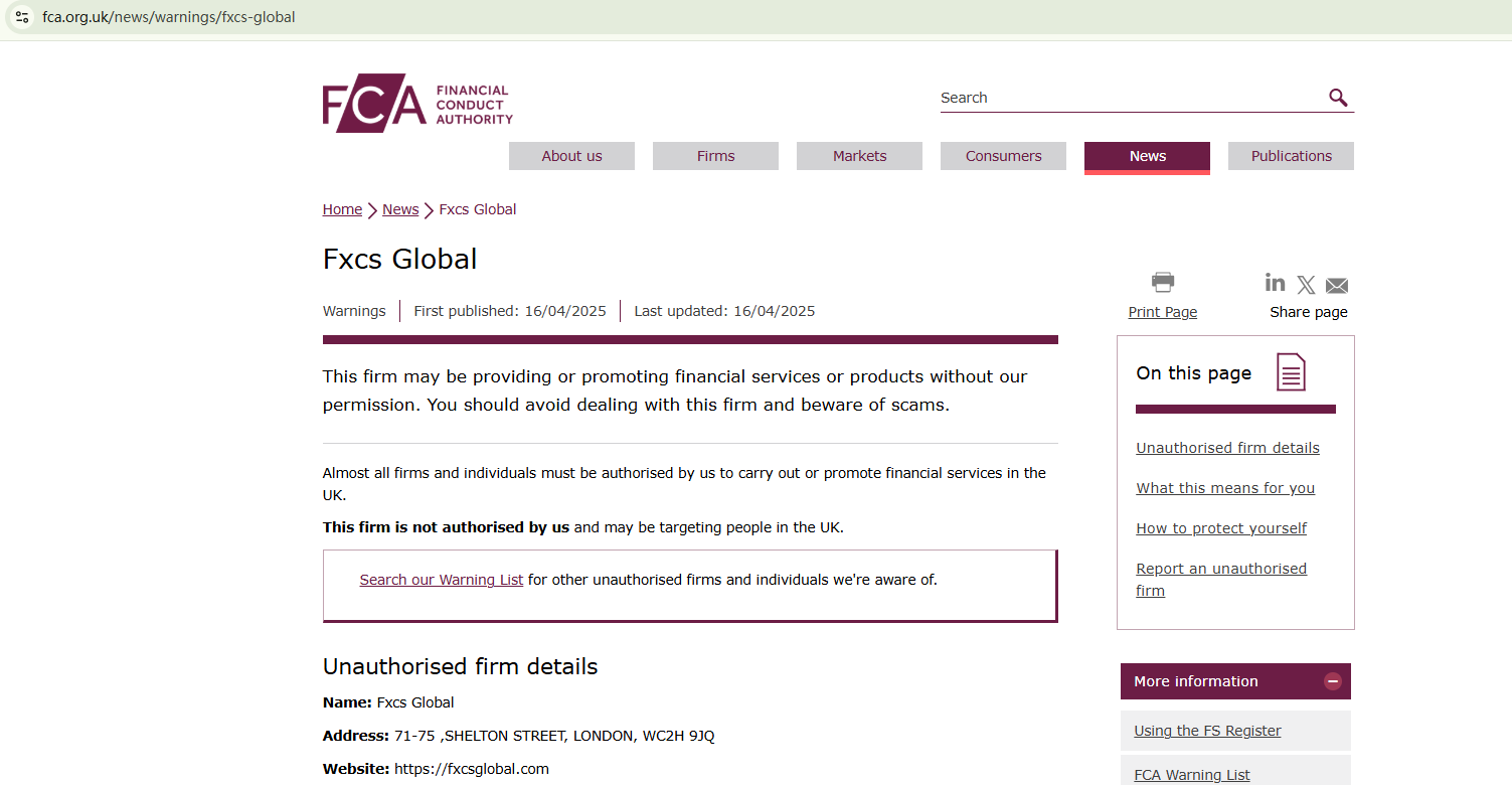 Fxcs Global employs a website template often linked to fraudulent investment schemes to create an online presence and appear professional. The content and graphic designs are generic features of the template, rather than an accurate representation of the broker's offerings. This raises significant doubts about the authenticity and credibility of the entity. Although Fxcs Global claims to be registered in the UK, it lacks authorization from the Financial Conduct Authority (FCA). Consequently, the FCA has issued a formal warning against Fxcs Global, advising investors to avoid engaging with this unauthorized financial firm.