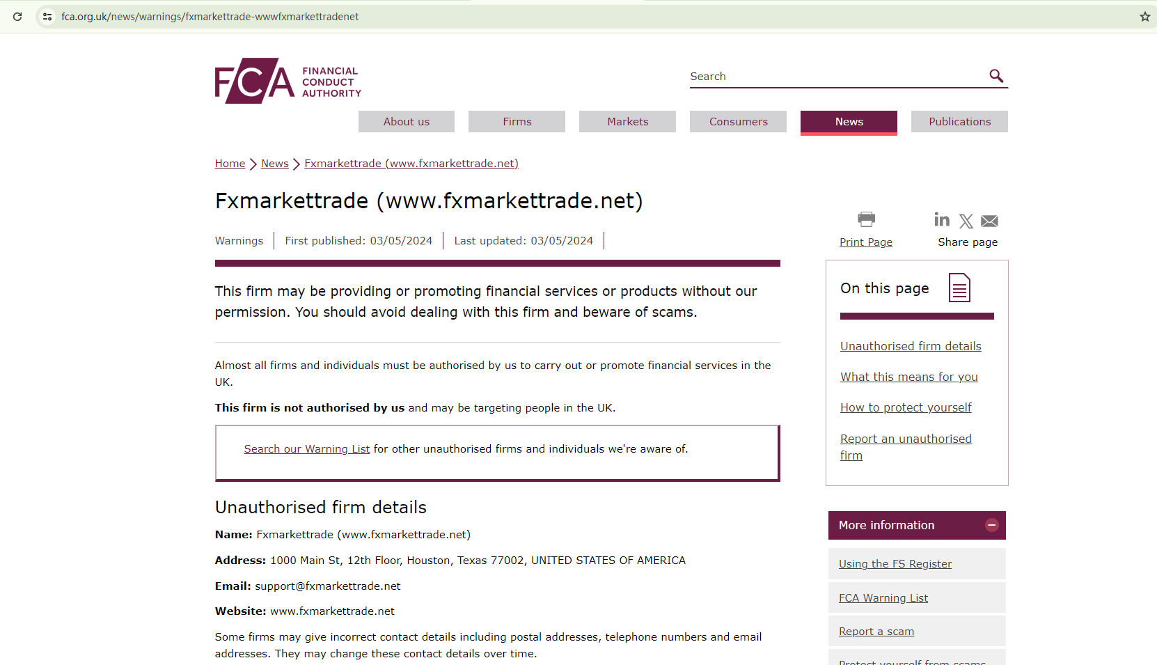 There are several signs suggesting that Fxmarkettrade appears to be a scam.This trading platform alleges to provide investment packages of extremely high Returns on Investment (ROI), which is a common tactic used by scammers to lure unwitting investors, especially newcomers.While it attempts to establish a present that has long history in the market, its domain name was actually registered at the end of 2023. This inconsistency is a red flag.The website even claims to be regulated by the Financial Conduct Authority (FCA). However, the FCA has issued a warning against Fxmarkettrade, refuting such claims and flagging it as an unauthorized firm.In essence, Fxmarkettrade is not regulated by any governing body. Entrusting it with investors' funds is highly risky, as there are no legal protections in place to safeguard the funds.Fxmarkettrade appears to be a scam.
