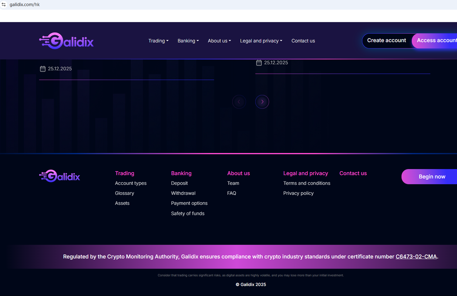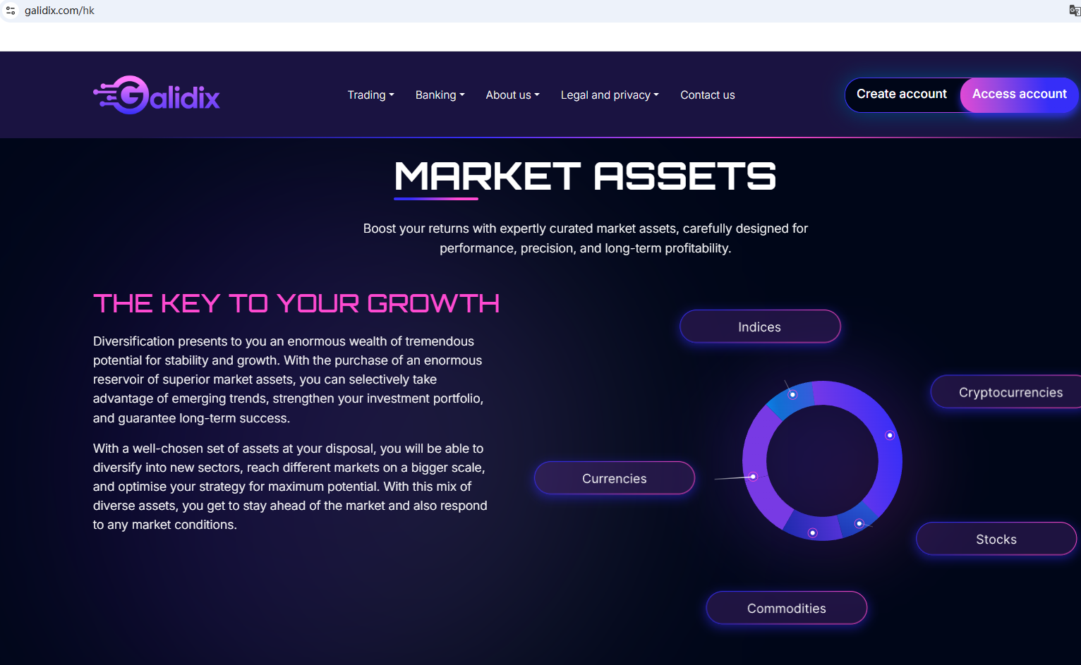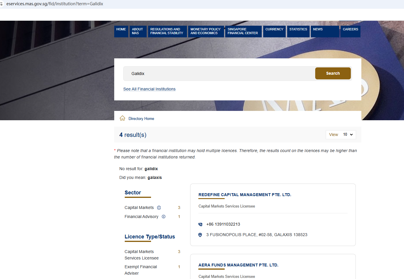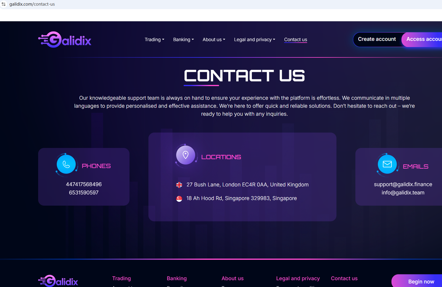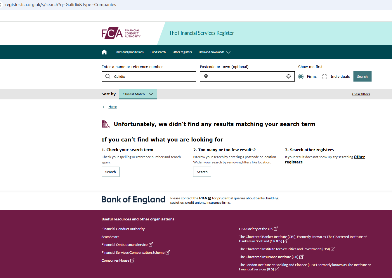 It displays two office addresses on its website, one in the UK and one in Singapore. A search revealed no matching information in the Financial Conduct Authority (FCA) and Monetary Authority of Singapore (MAS). In addition, the Financial Services and Markets Authority (FSMA) issued a warning about Galidix for the lack of the required authorization.