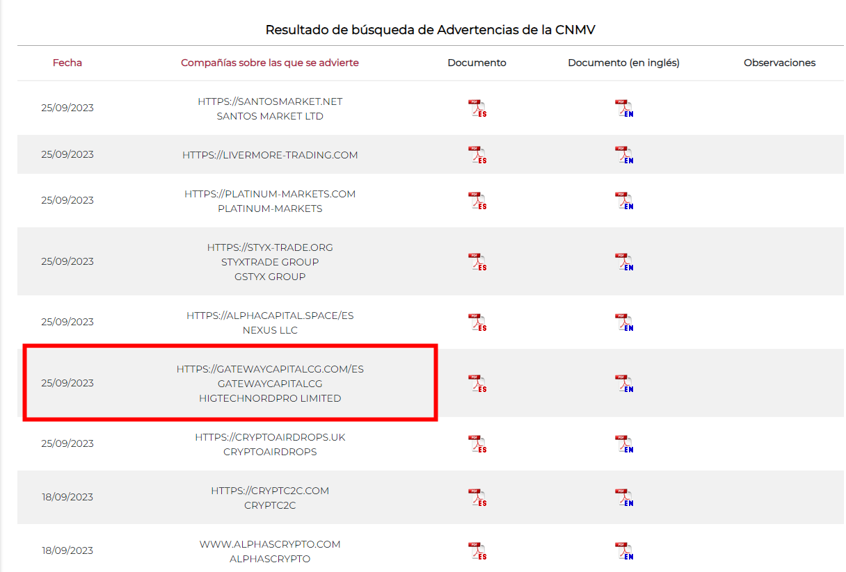 The Comisión Nacional del Mercado de Valores (CNMV) issued a warning that GATEWAYCAPITALCG was providing finacial services or products without authorisation.