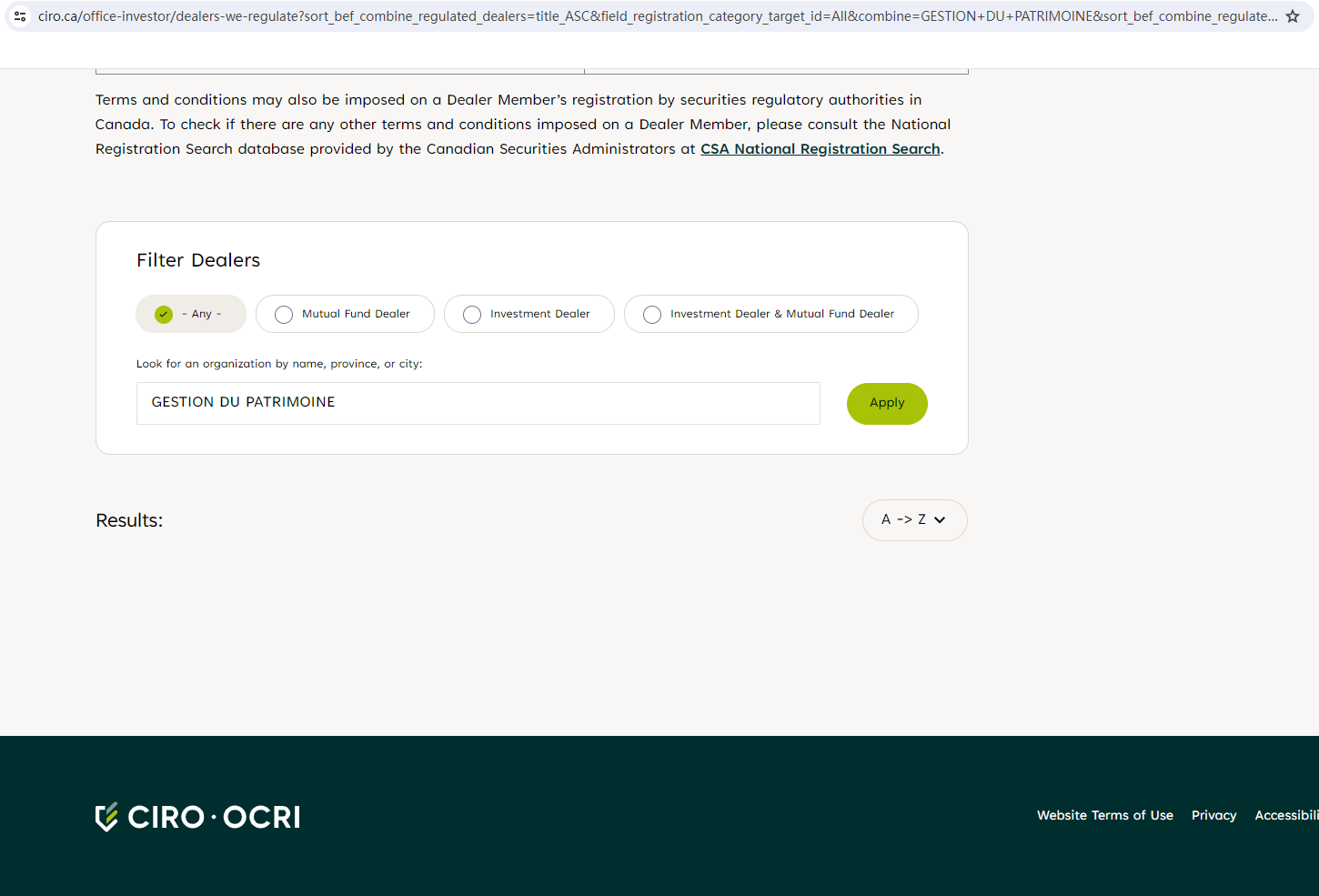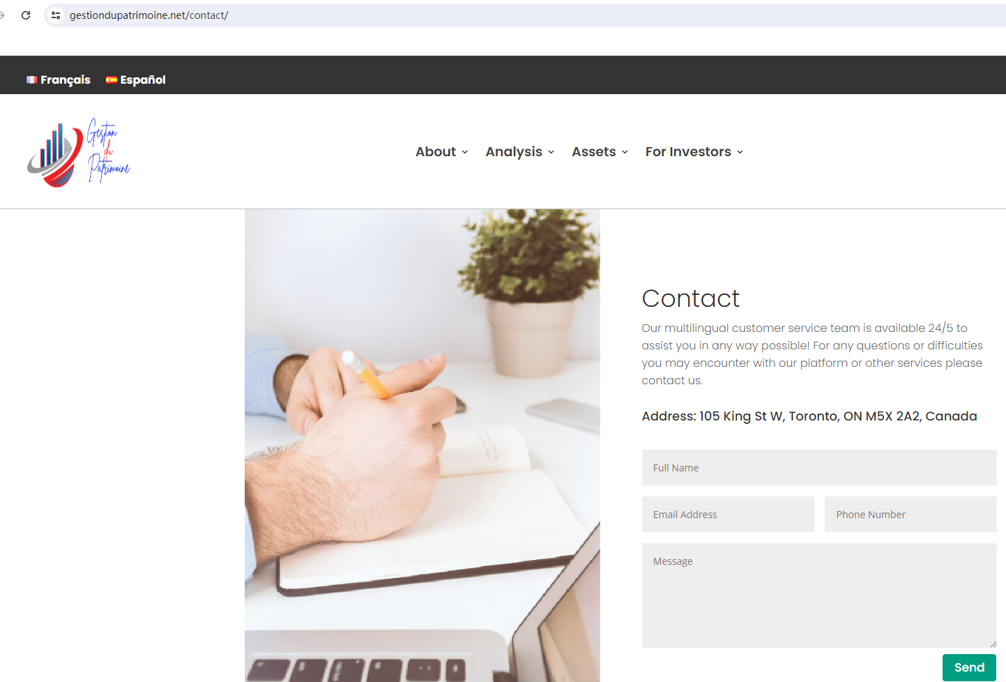 According to its website, it is located in the Canada. Upon investigation, no matching information was found in the Investment Industry Regulatory Organization of Canada (IIROC).In addition, the Comisión Nacional del Mercado de Valores (CNMV) added GESTION DU PATRIMOINE to its warning list for providing investment services without authorization.The truth is that GESTION DU PATRIMOINE is not regulated by any regulators. Letting it hold or control investors' money is unsafe, and the money can not be protected by any laws.GESTION DU PATRIMOINE is a scam.