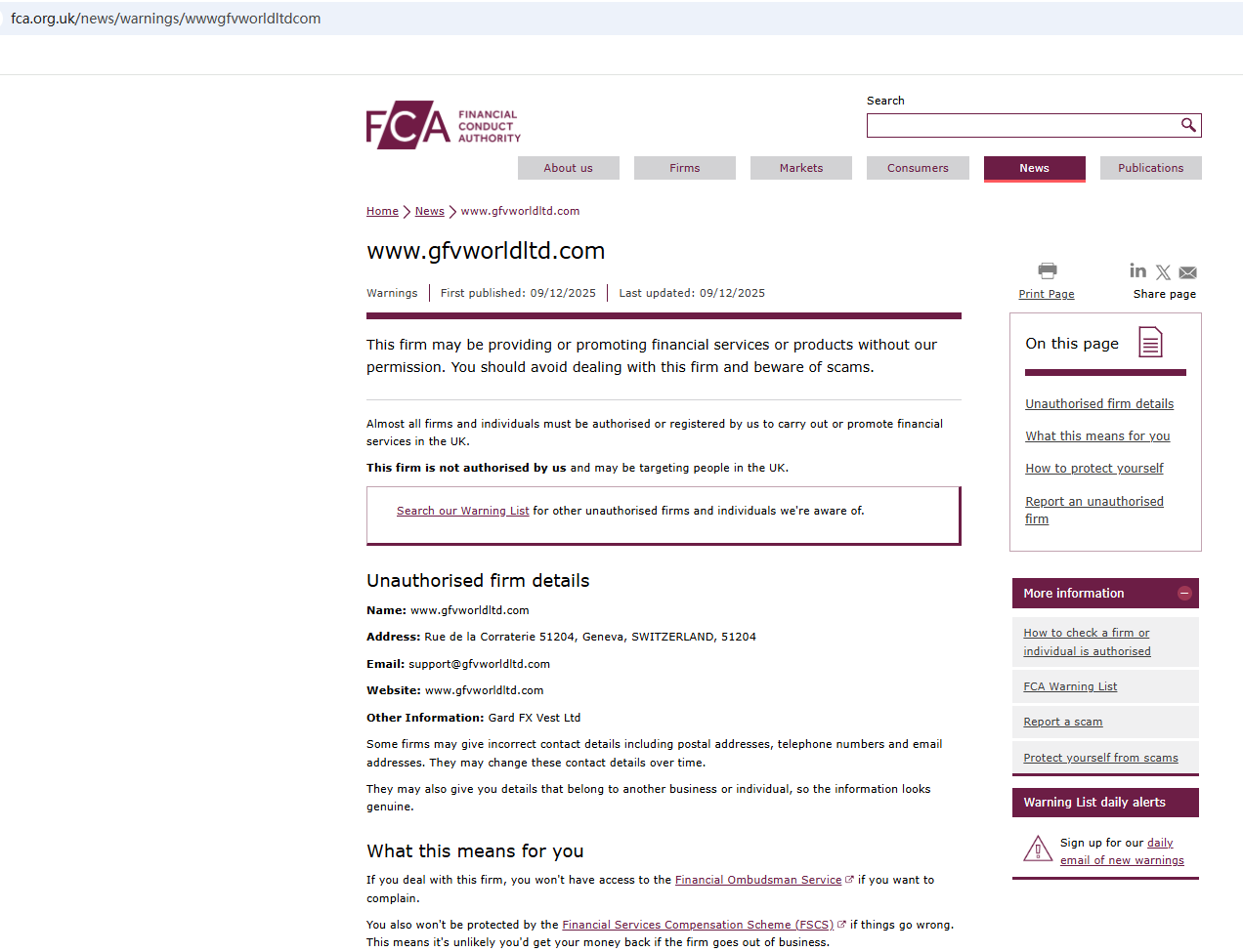 On Dec 9, 2025, the Financial Conduct Authority (FCA) issued a warning regarding gfvworldltd.com, suspecting that this company may be offering financial services or products without the necessary authorization. https://www.fca.org.uk/news/warnings/wwwgfvworldltdcom