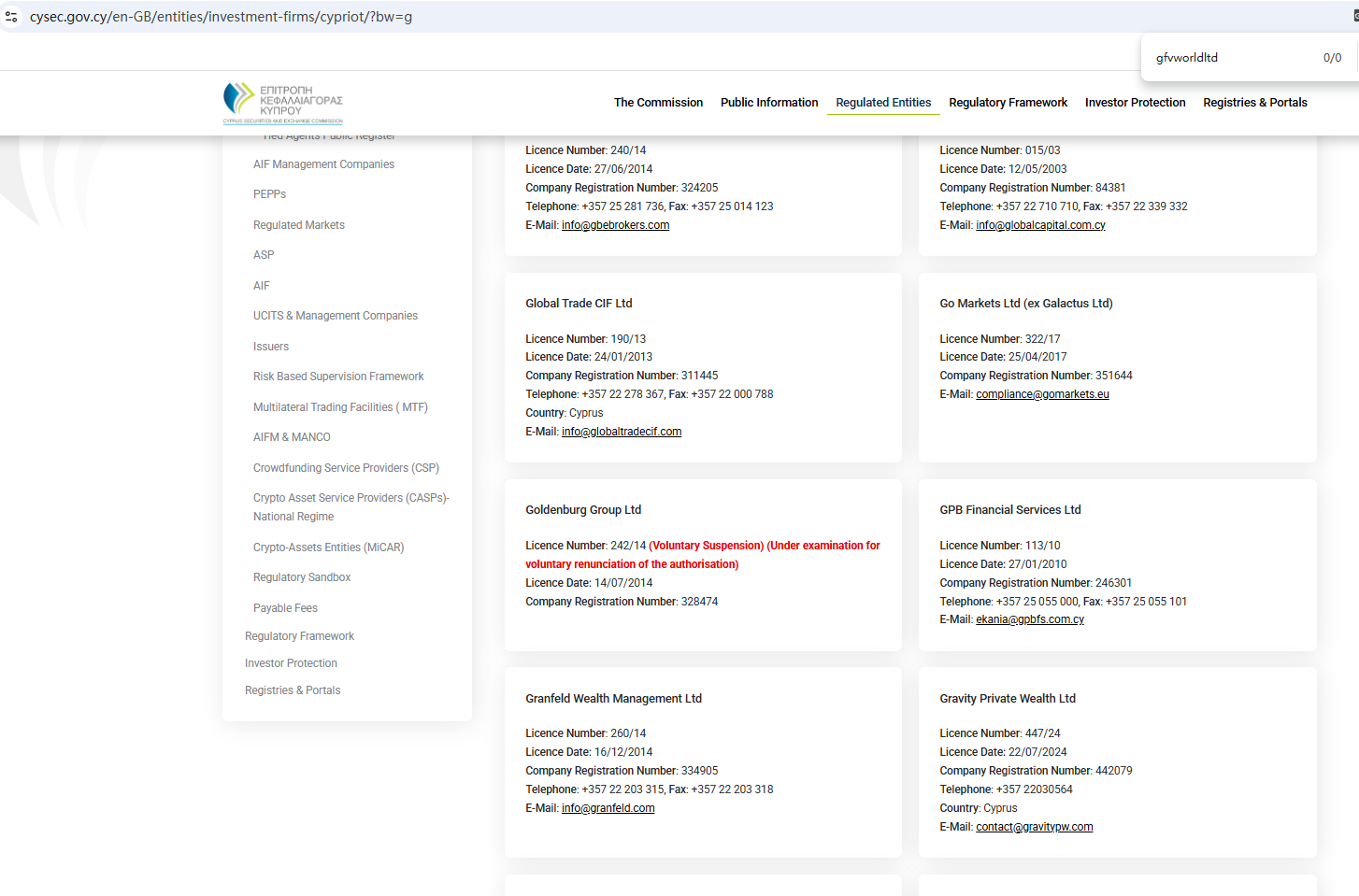 According to its website, it is regulated by both the Financial Conduct Authority (FCA) and the Cyprus Securities and Exchange Commission (CySEC). However, a search revealed no matching information with CySEC. Furthermore, the FCA issued a warning regarding gfvworldltd.com, suspecting that this company may be offering financial services or products without the necessary authorization.