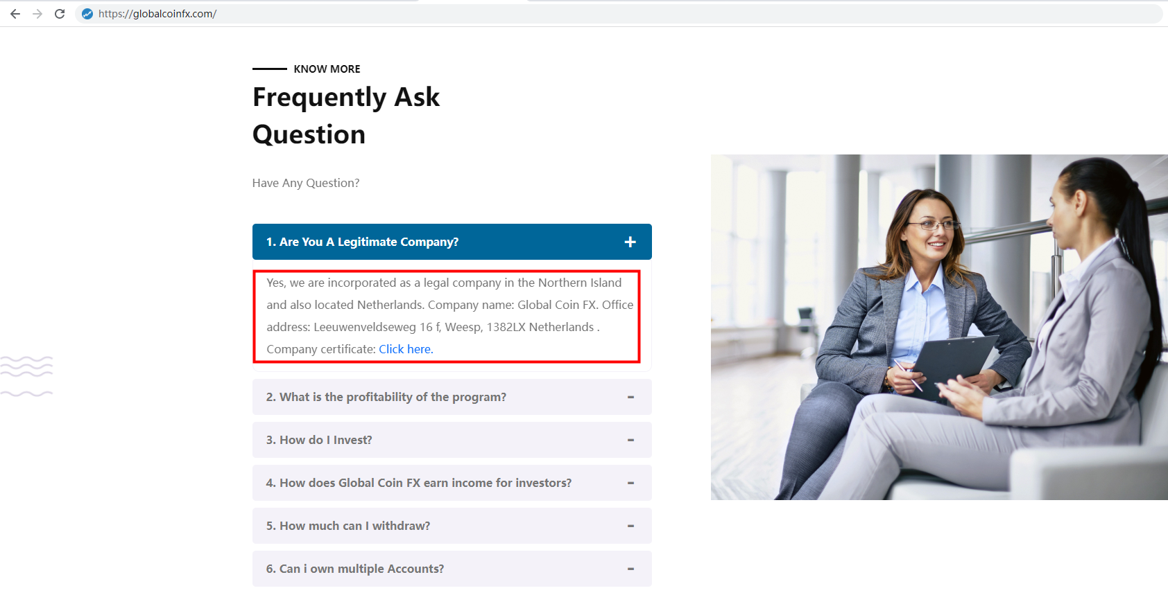 Global Coin FX claims to be incorporated as a legal company in the Northern Island and also located Netherlands. But we don't find the correct information on the Dutch Authority for the Financial Markets (AFM) matching to Global Coin FX. The truth is that Global Coin FX is not under valid regulation by any regulators to do forex. Investors' funds in this broker are unsafe and cannot be protected by any law.