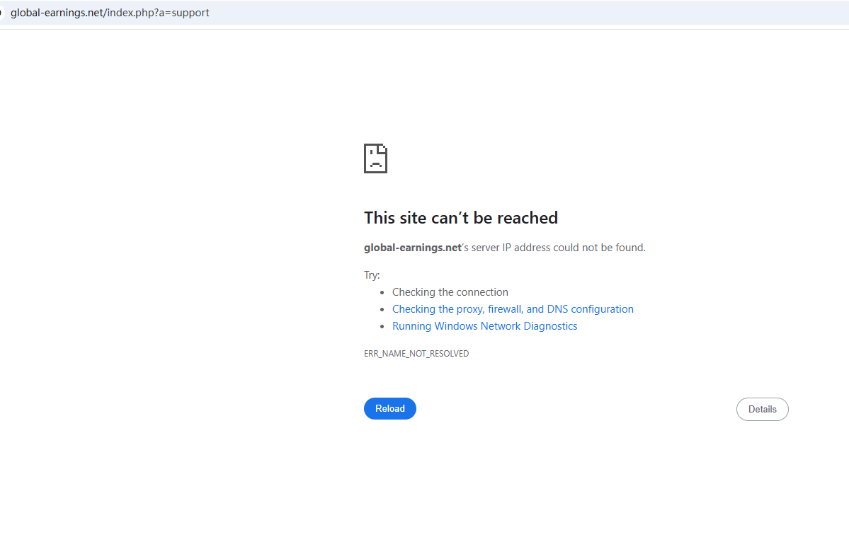 BrokersView found that the domain "https://global-earnings.net/index.php?a=support" is currently inaccessible. This is widely regarded as a significant red flag, as the suspension of a broker's website often points to underlying regulatory or operational issues.
