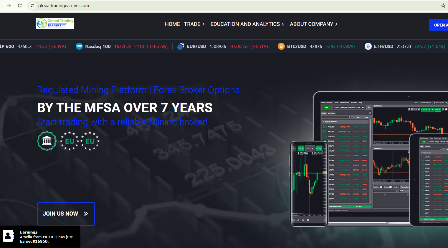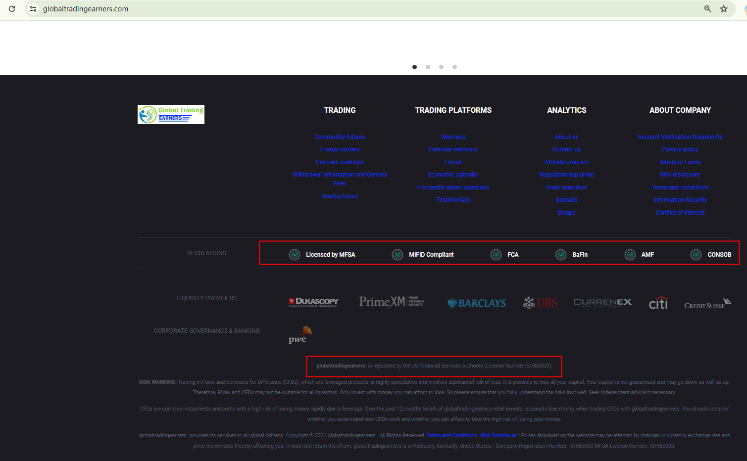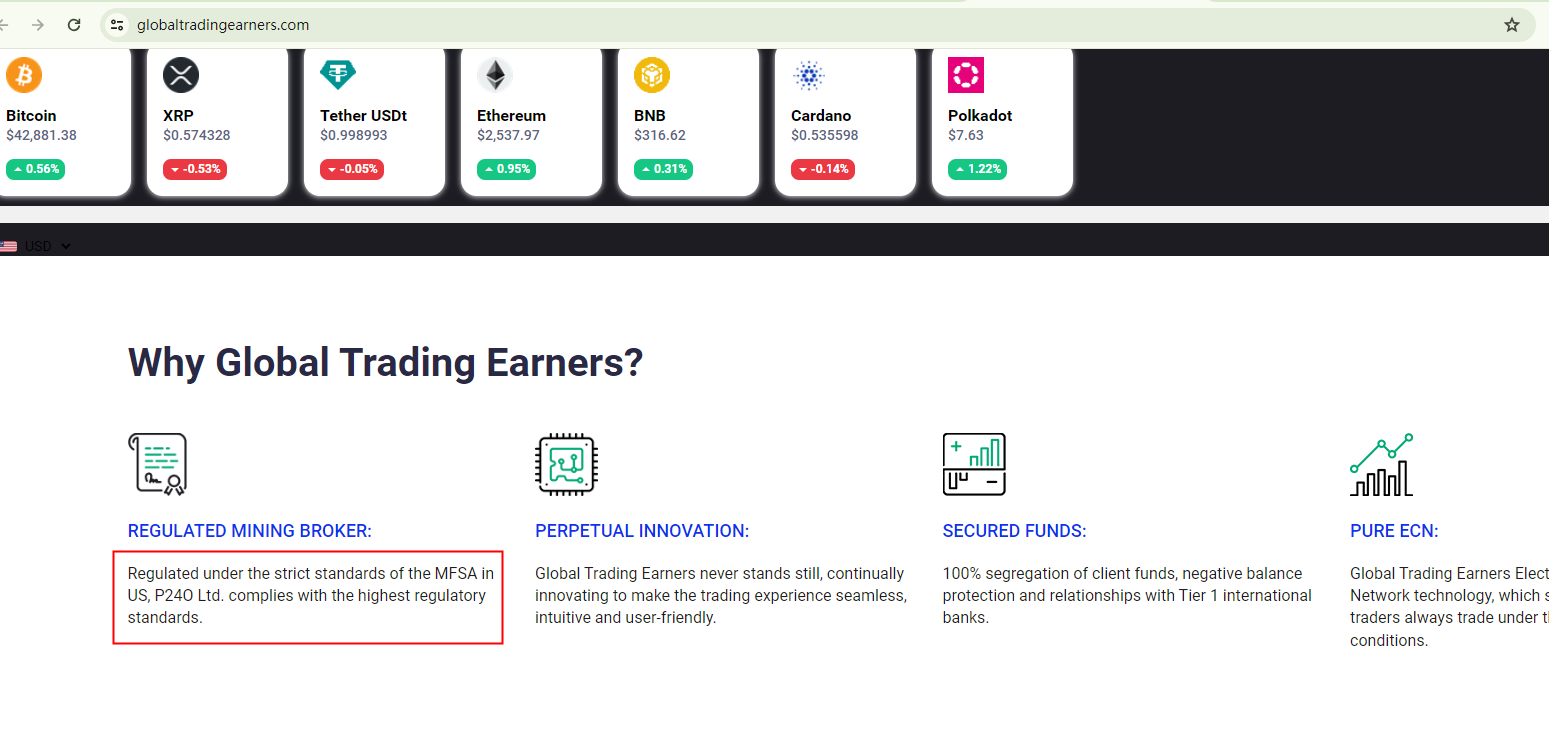 Global Trading Earners claims to be operated by P24O Ltd, a company supposedly regulated by the "MFSA in the US". This error reveals the unreliability of this forex broker. In reality, the MFSA, or Malta Financial Services Authority, is based in Malta, not the US. The MFSA has issued a warning against Global Trading Earners, saying that neither the forex brand nor P24O Ltd are authorized or regulated by it.