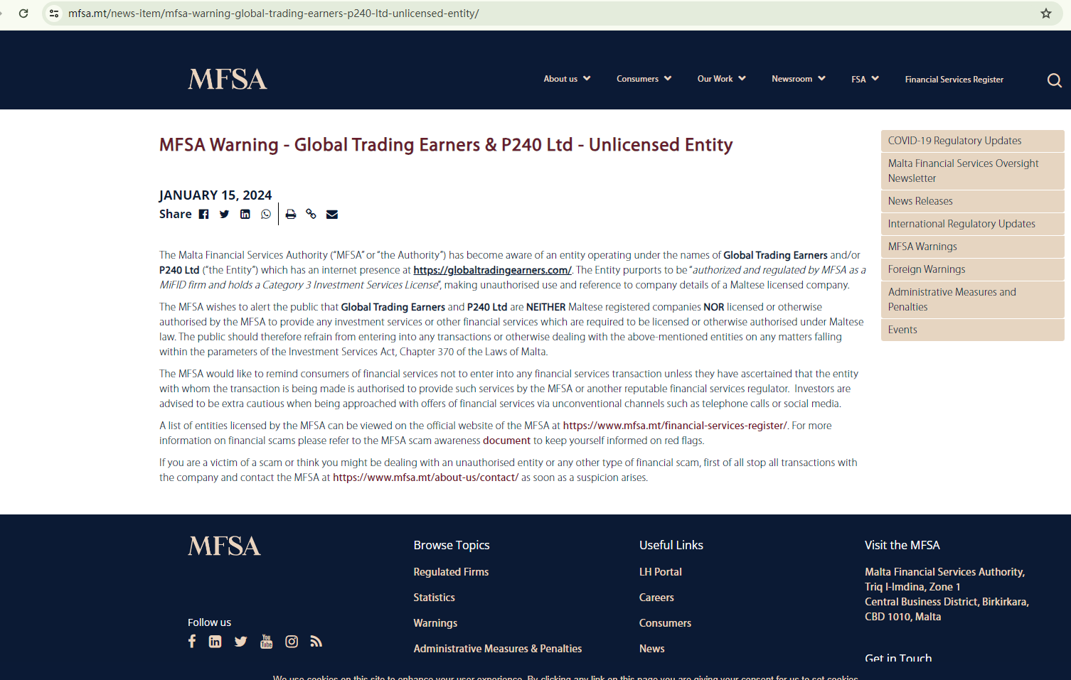 On January 15, 2024, the Malta Financial Services Authority (MFSA) issued a warning against Global Trading Earners, stating this broker is neither a Maltese registered company nor licensed or otherwise authorised by the MFSA to provide any investment services or other financial services which are required to be licensed or otherwise authorised under Maltese law. https://www.mfsa.mt/news-item/mfsa-warning-global-trading-earners-p240-ltd-unlicensed-entity/