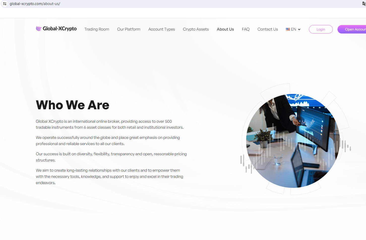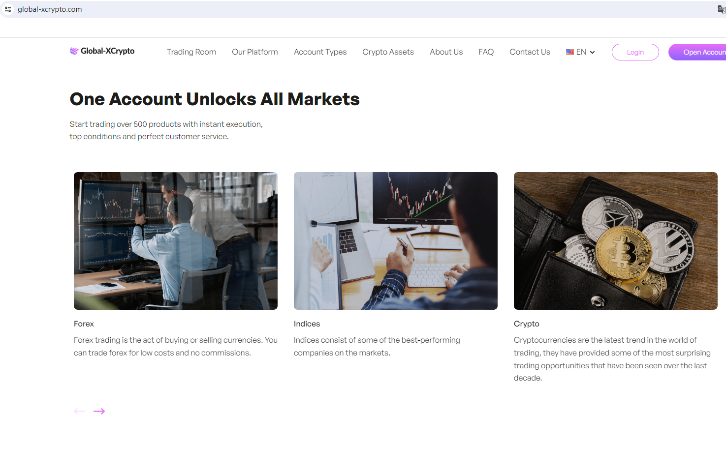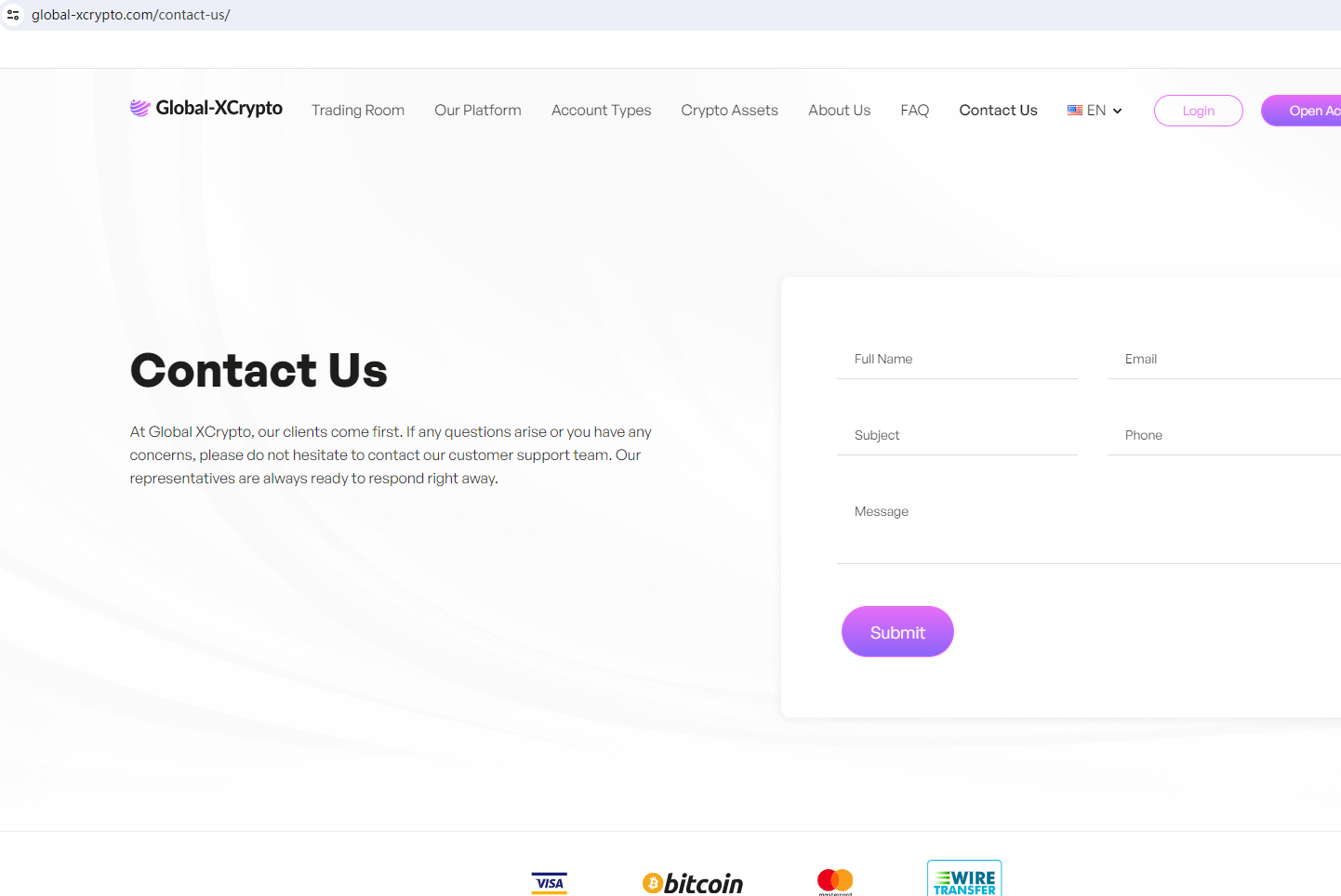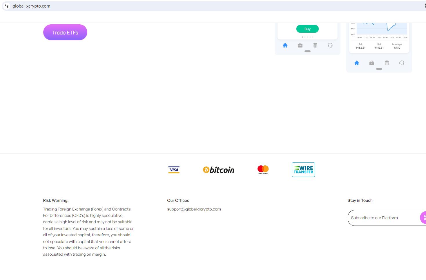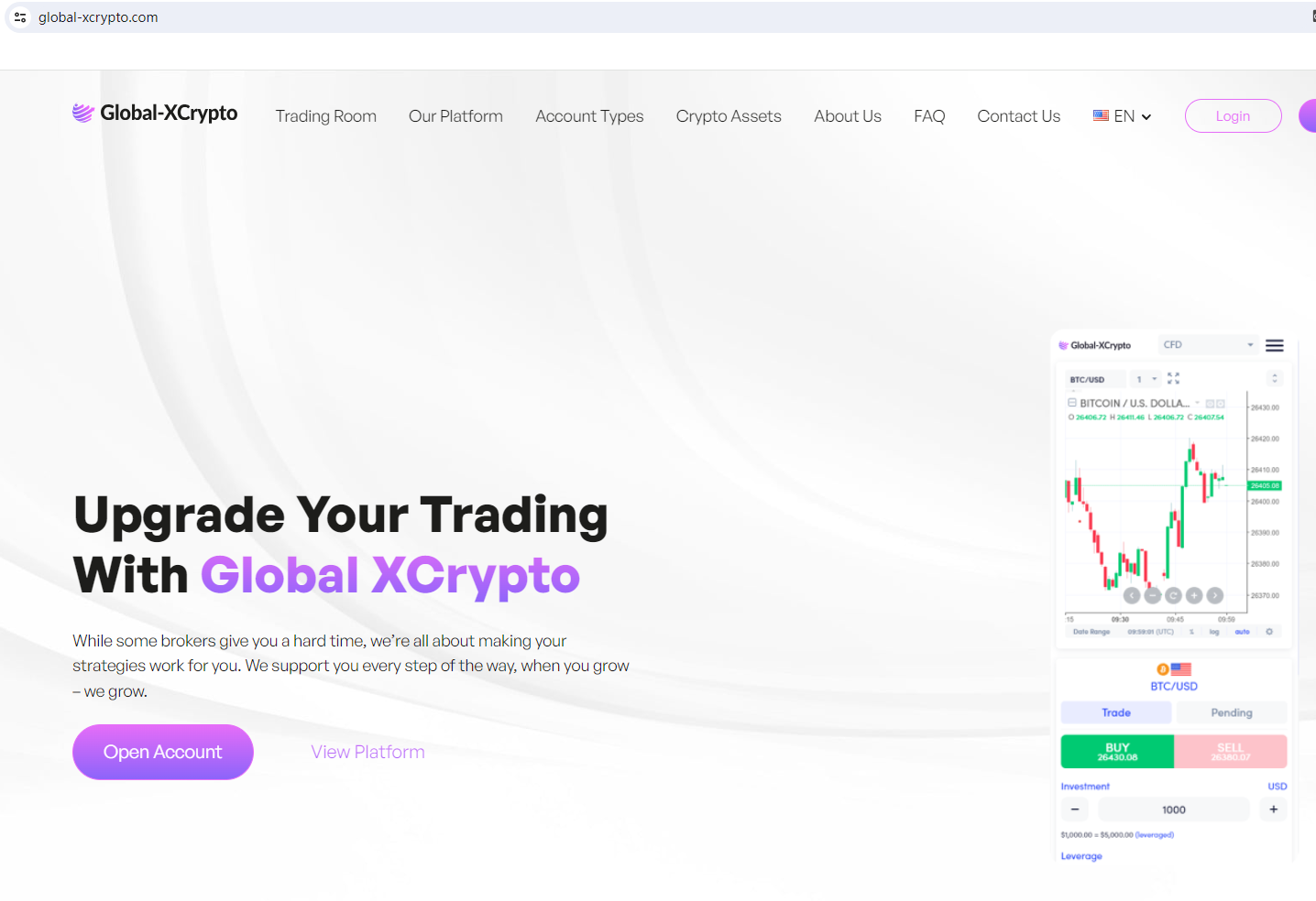 Global xcrypto claims to be a reliable company without presenting any information about its regulation or contact. The lack of such important information may be a distinct signal of an unlicensed broker, as regulated companies always present their accreditations and licenses in a prominent position. It is a red flag.