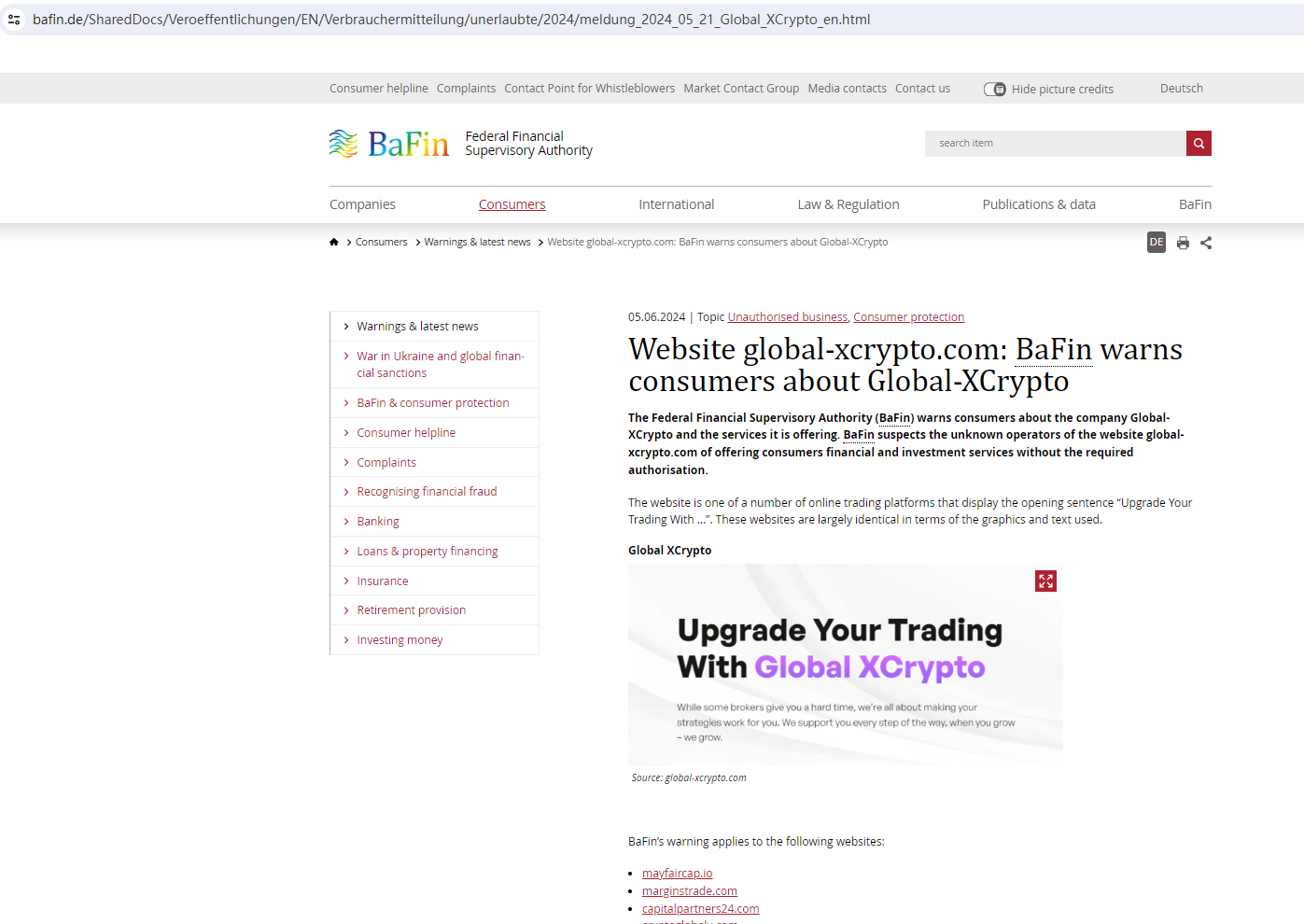 The Federal Financial Supervisory Authority (BaFin) issued a warning that Global xcrypto was providing financial services or products without authorisation.