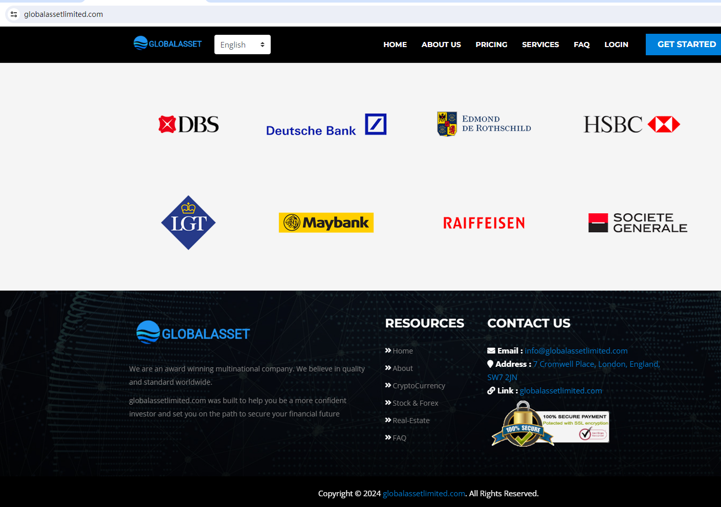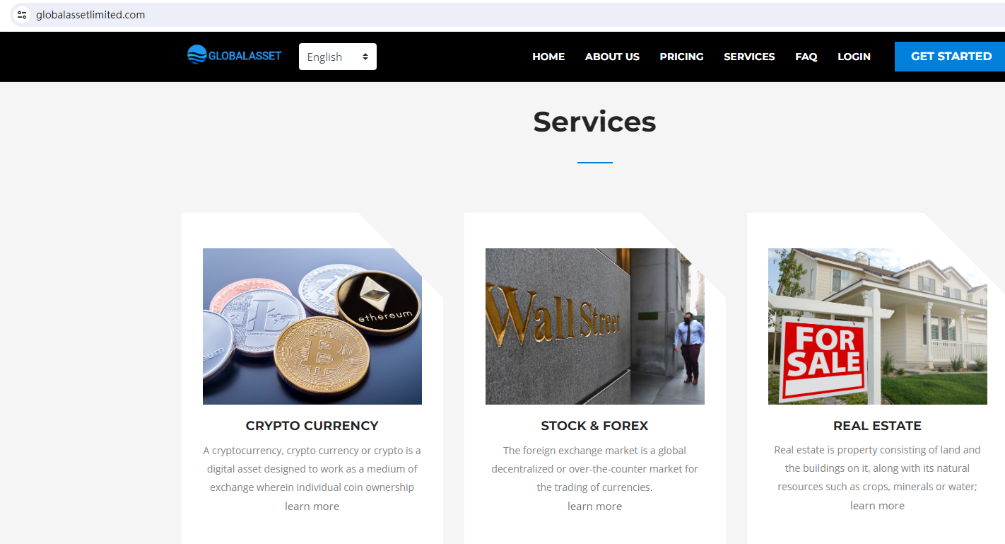 GLOBALASSET claims to be a reliable company without presenting any information about its regulation.GLOBALASSET locates in the U.K, but the United Kingdom Financial Conduct Authority (UK FCA) issued a warning that GLOBALASSET was providing finacial services or products without authorisation.The truth is that GLOBALASSET is not regulated by any regulators. Letting it hold or control investors' money is unsafe, and the money can not be protected by any laws.GLOBALASSET is a scam.
