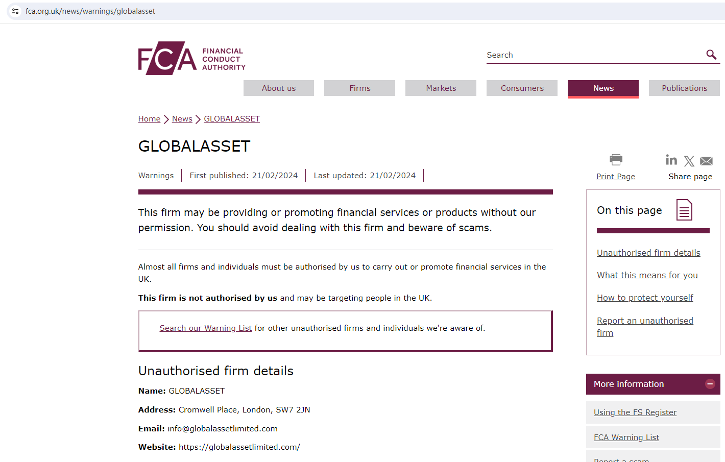 GLOBALASSET locates in the U.K, but the United Kingdom Financial Conduct Authority (UK FCA) issued a warning that GLOBALASSET was providing finacial services or products without authorisation.