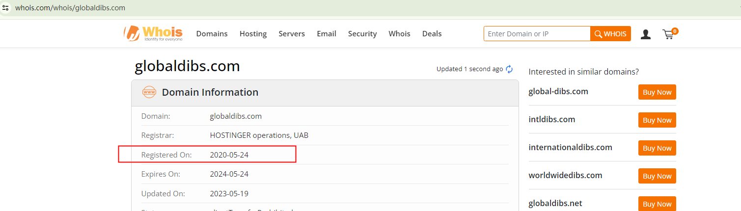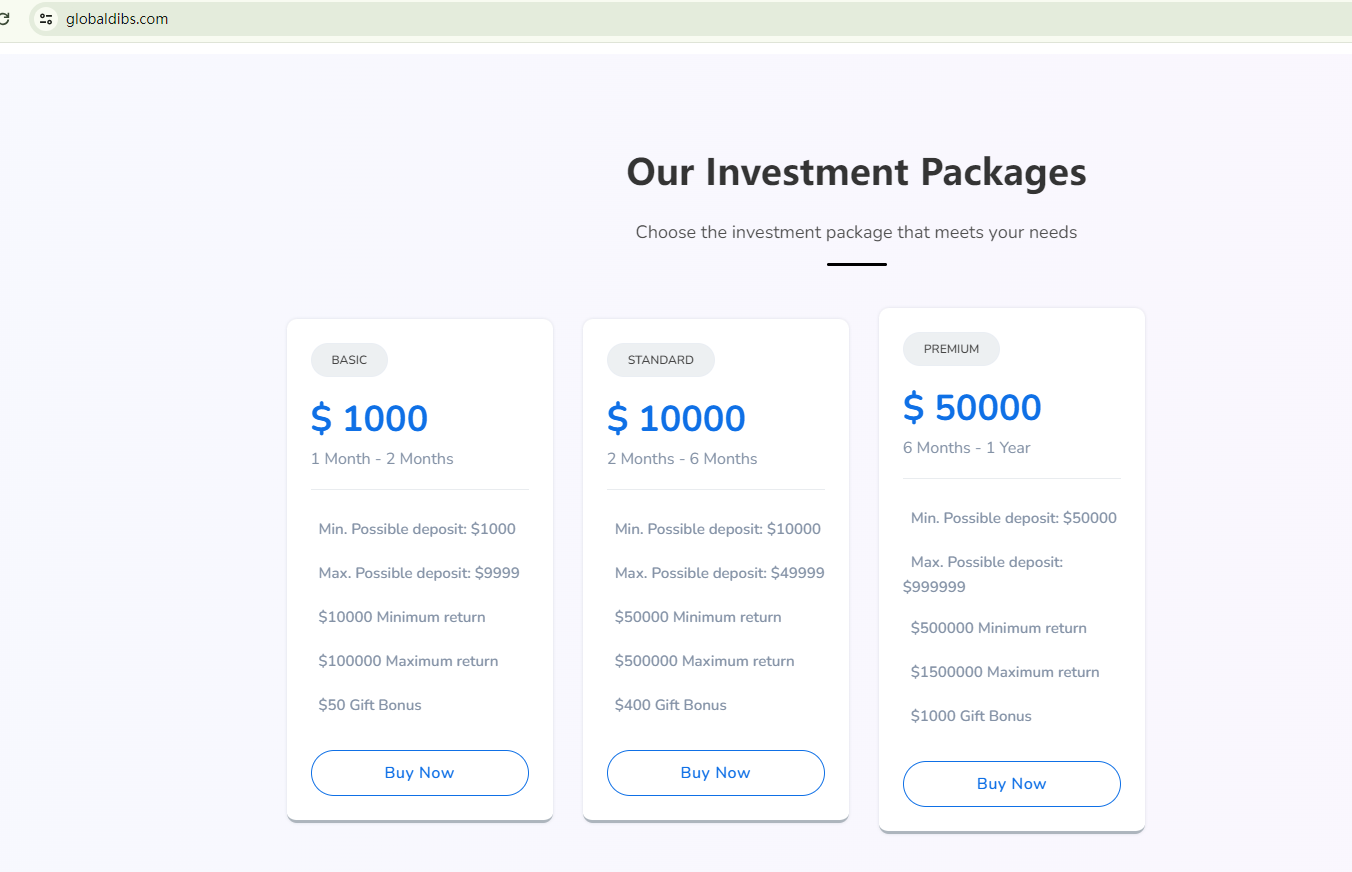What's more, Globaldibs offers investment packages promising unusually high returns, a common sign of investment scams. Its domain name, globaldibs.com, was registered in May 2020, contradicting its claim of establishment in 2010, which raises another red flag.