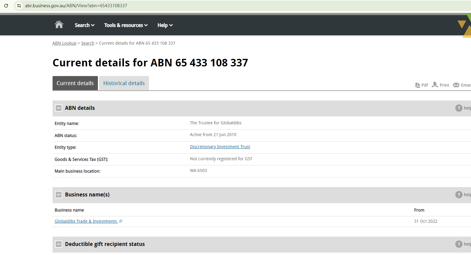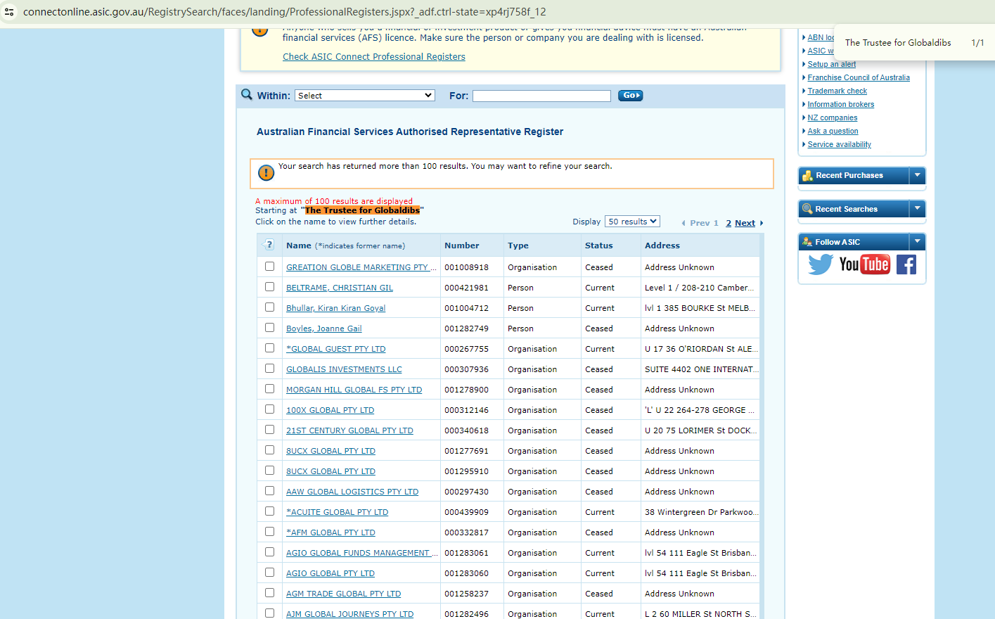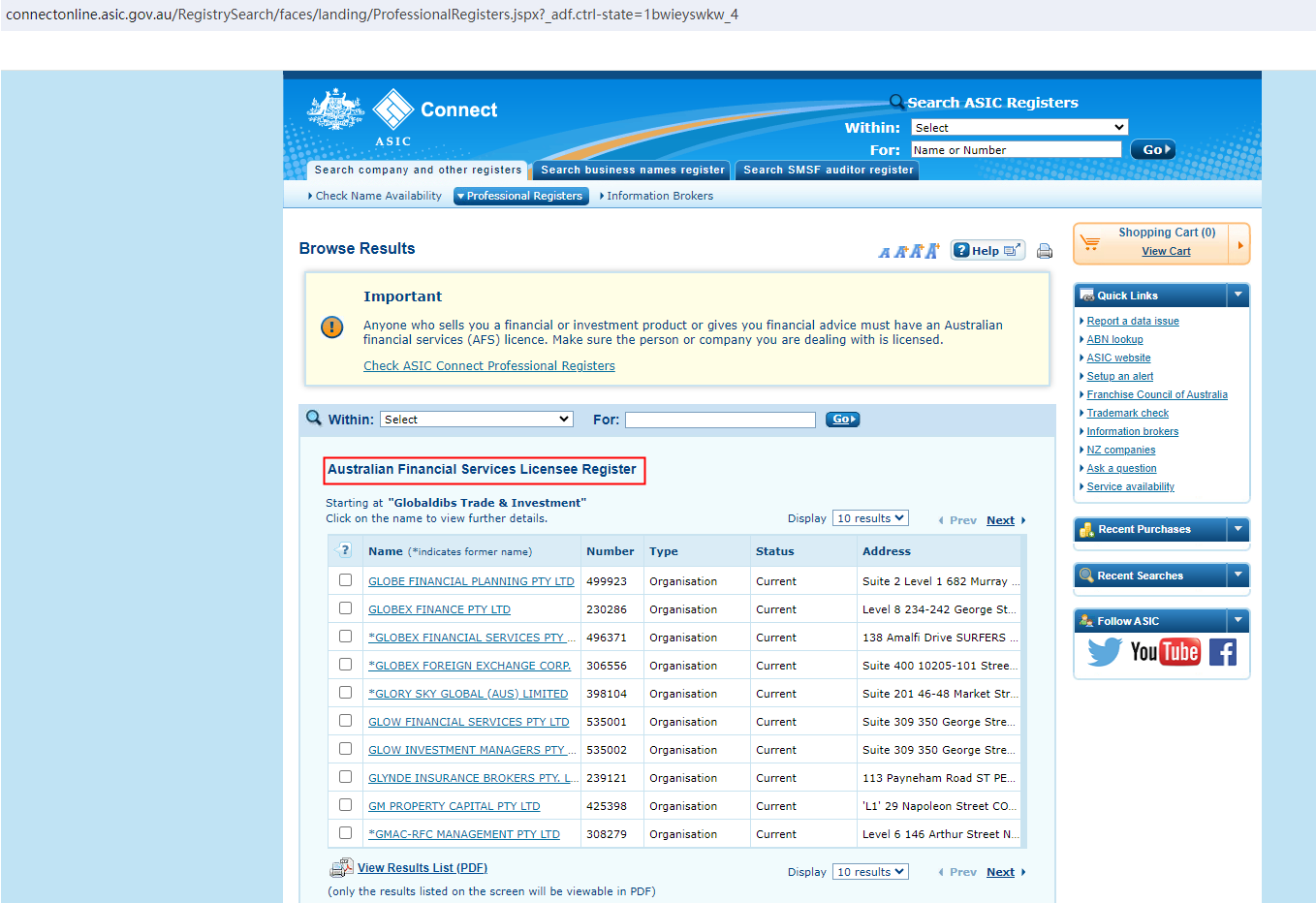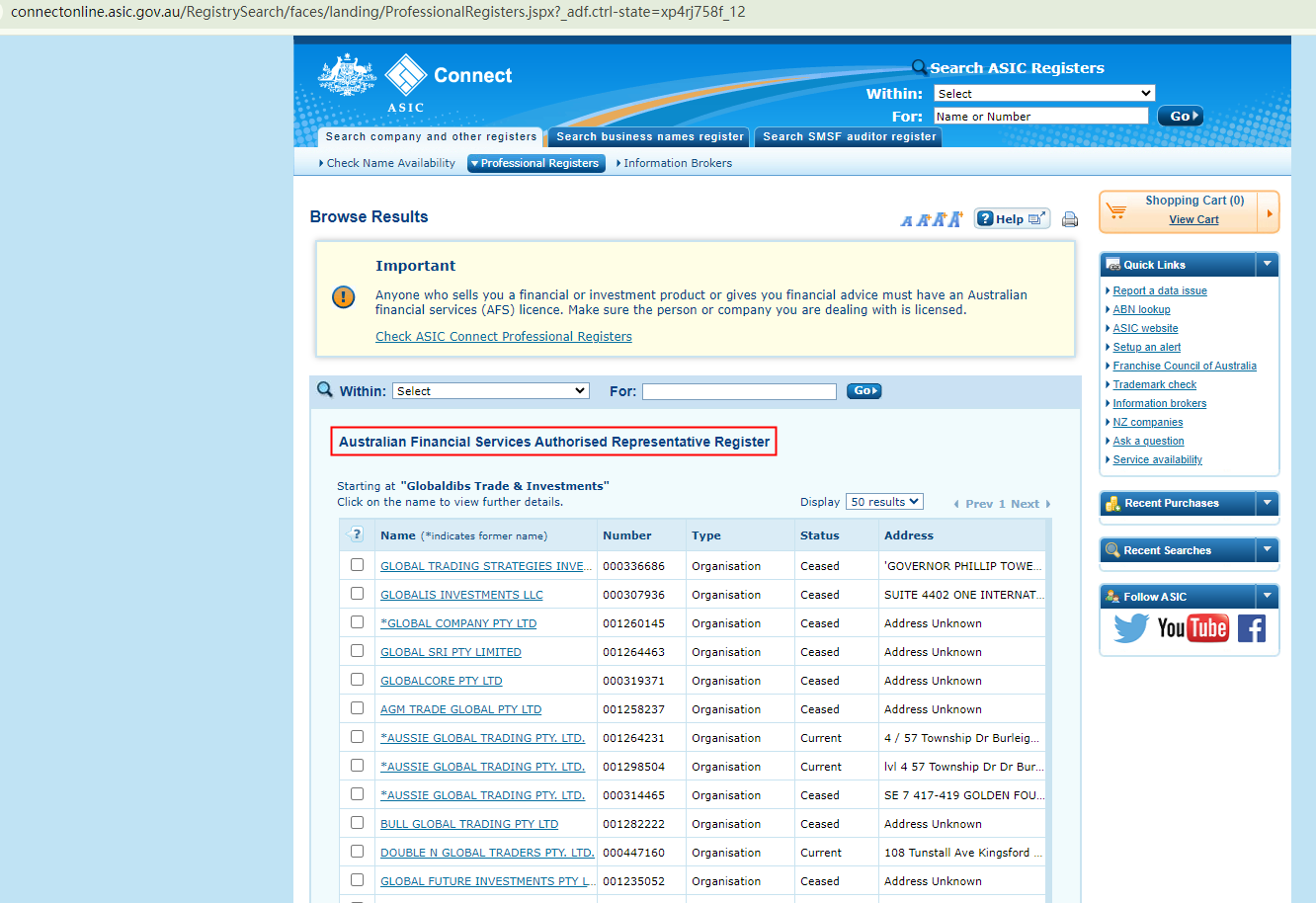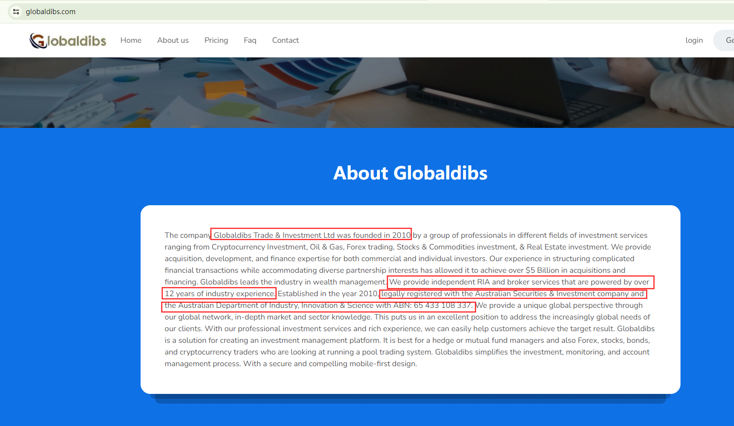 While this appears to be true, it is crucial to note that the ASIC has stated that a person or entity that provides financial or investment products or advice is required to have an AFS license. However, Our search revealed no matching records for either "Globaldibs Trade & Investment" or "The Trustee for Globaldibs", indicating that it is not ASIC-licensed.