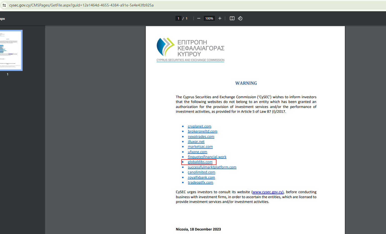 In addition, the Cyprus Securities and Exchange Commission (CySEC) added Globaldibs to its warning list, stating it does not belong to an entity which has been granted an authorization for the provision of investment services and/or the performance of investment activities in Cyprus.