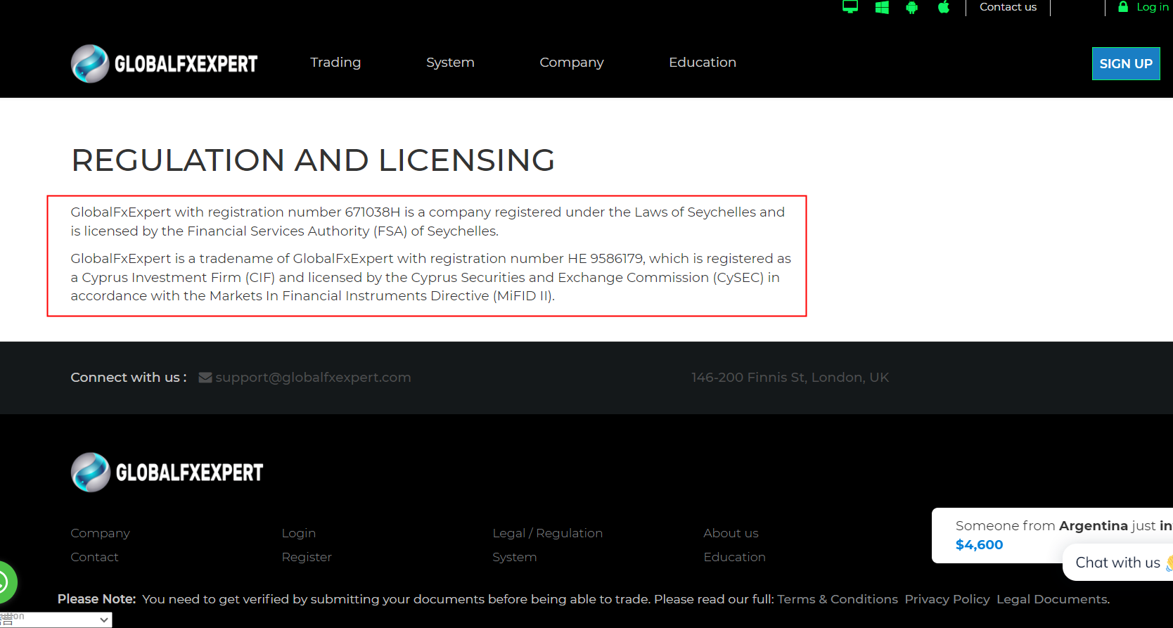 According to its website, it claims regulated by Cyprus Securities and Exchange Commission (CySEC), Seychelles Financial Services Authority (Seychelles FSA). Upon investigation, there is no matching information was found in the regulators.In addition, the Seychelles Financial Services Authority (Seychelles FSA) issued a warning that GlobalFXExpert was providing finacial services or products without authorisation.The truth is that GlobalFXExpert is not regulated by any regulators. Letting it hold or control investors' money is unsafe and the money can not be protected by any laws.Therefore, GolbalFXExpert is a scam.