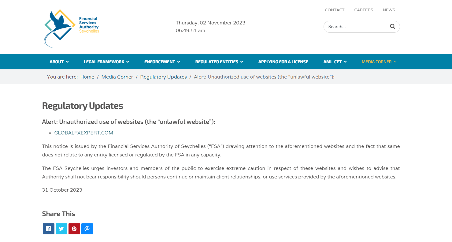In addition, the Seychelles Financial Services Authority (Seychelles FSA) issued a warning that GlobalFXExpert was providing finacial services or products without authorisation.