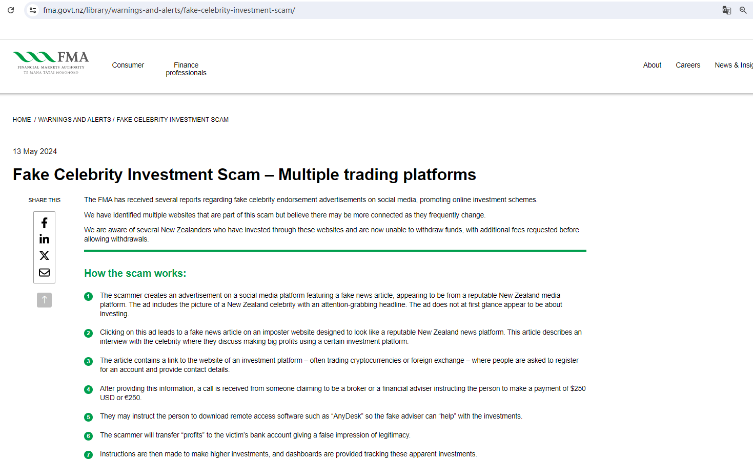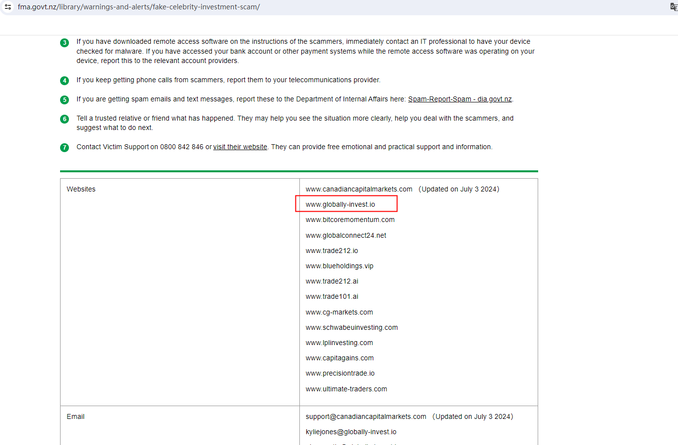 In addition, the New Zealand Financial Markets Authority (NZ FMA) issued a warning, revealing a fake celebrity investment scam and exposing a list of fake trading platforms involved in this scam, including Globally Invest.