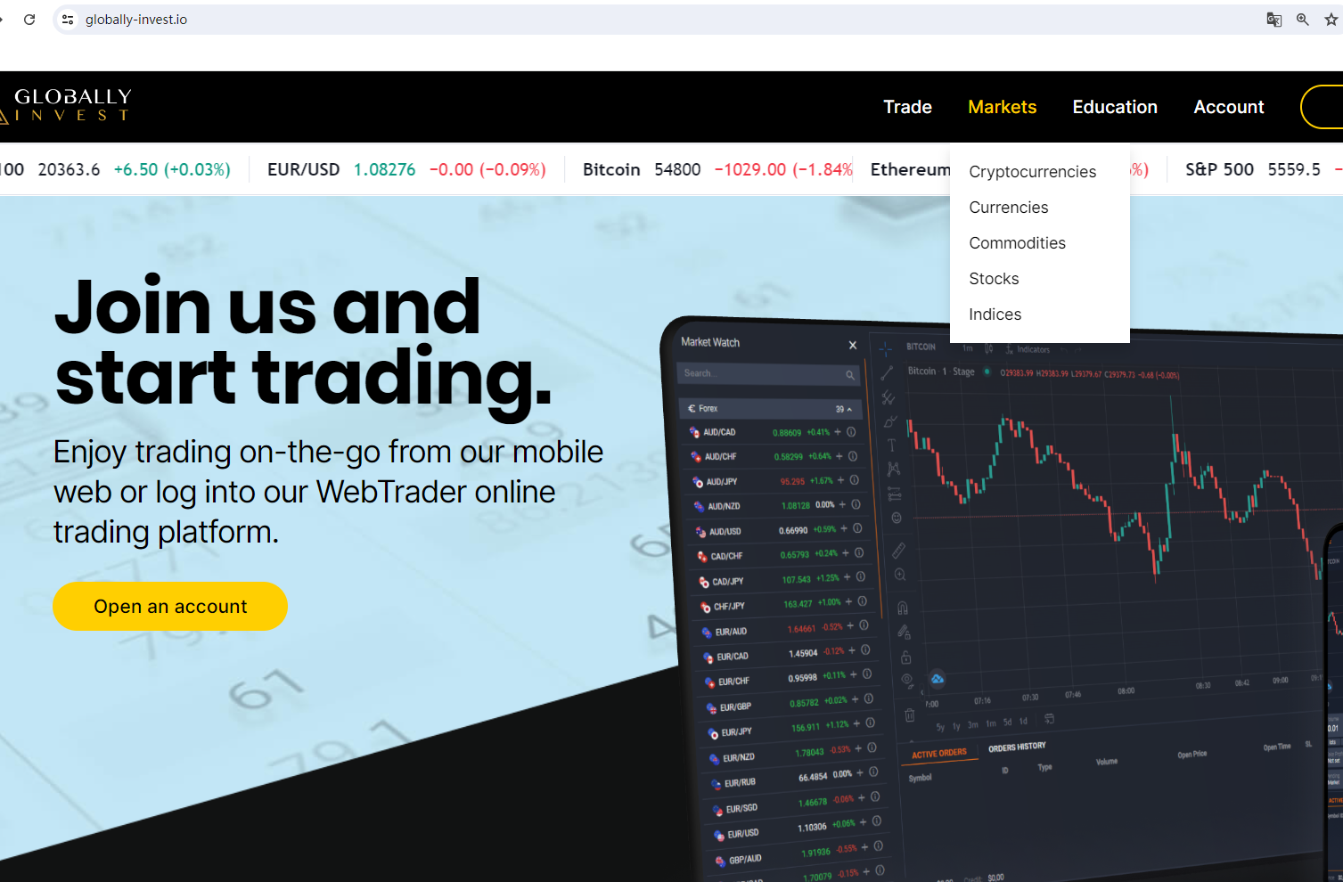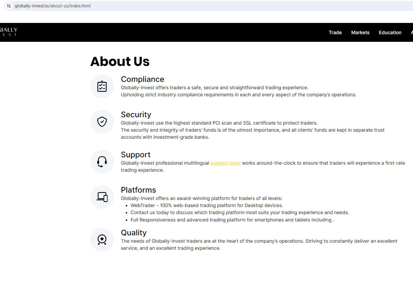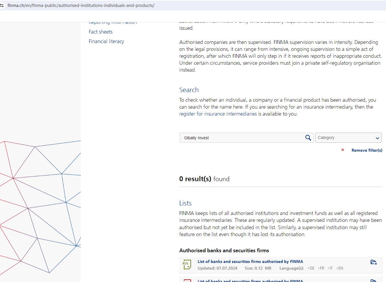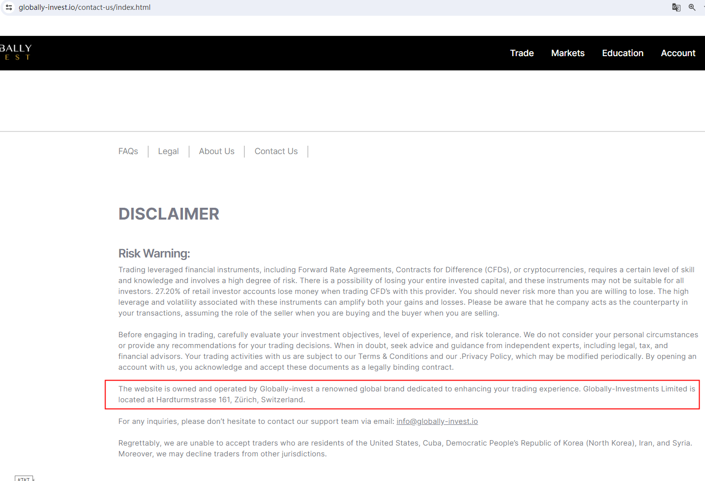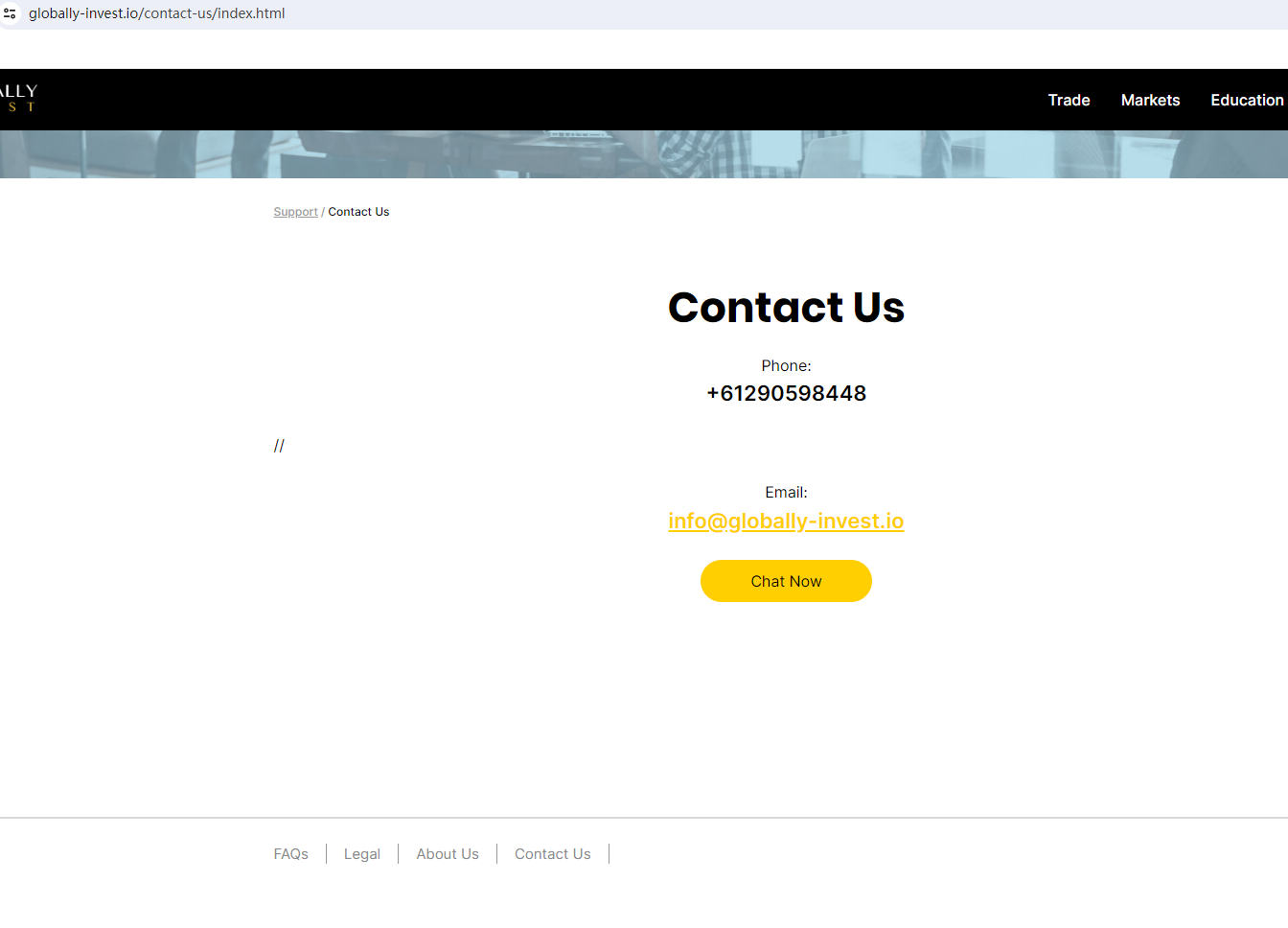 According to its website, it is located in the Switzerland. Upon investigation, no matching information was found in the Swiss Financial Market Supervisory Authority (FINMA). In addition, the New Zealand Financial Markets Authority (NZ FMA) issued a warning, revealing a fake celebrity investment scam and exposing a list of fake trading platforms involved in this scam, including Globally Invest.In essence, Globally Invest is not regulated by any governing body. Entrusting it with investors' funds is highly risky, as there are no legal protections in place to safeguard the funds.Globally Invest appears to be a scam.