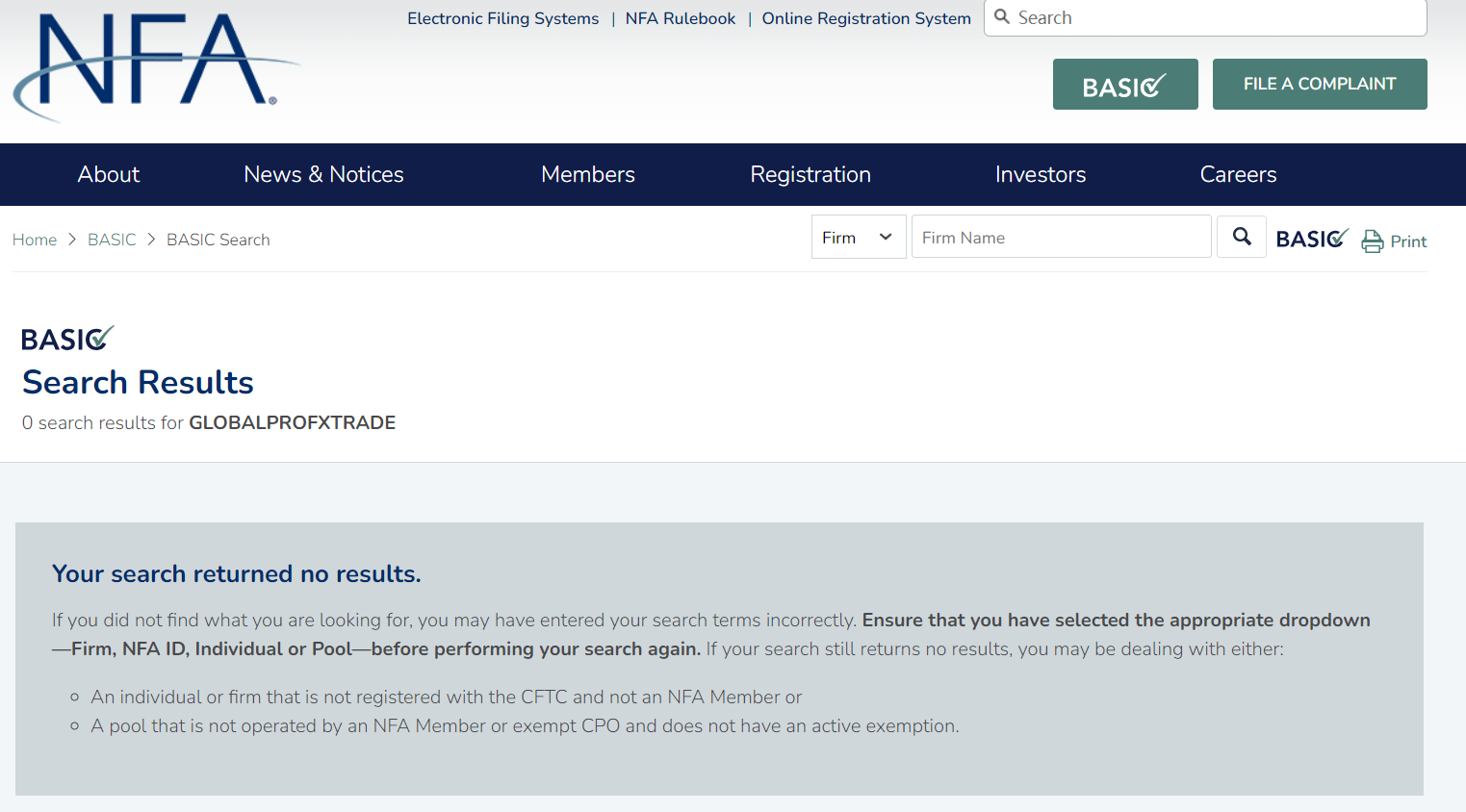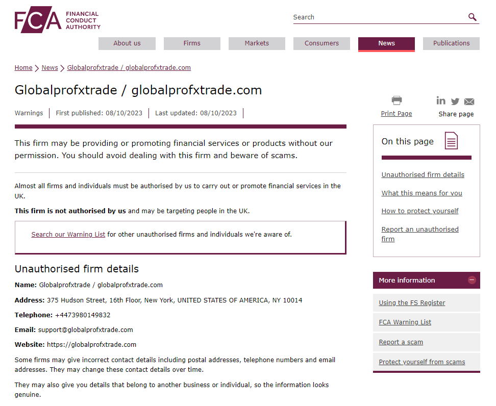 ANSWER Yes, Globalprofxtrade has been warned by the Financial Conduct Authority (FCA) for carrying on unauthorized activities in the UK. This appears to be fraudulent scheme.There are several red flags suggesting that Globalprofxtrade is a scam.Globalprofxtrade claims to be founded in 2010. However, its domain name, globalprofxtrade.com, was first created in July 2023. This discrepancy strongly suggests that it is not an honest company.While having an address in the US, Globalprofxtrade fails to be registered as an member of the National Futures Association (NFA). As per US law, forex brokers in this country are required to be regulated by the Commodity Futures Trading Commission (CFTC) and the NFA. Non-NFA members are not allowed to accept American customers.In addition to the illegal operations in the US, Globalprofxtrade also provides financial services or products in the UK without the necessary financial licenses. As such, the FCA, the financial watchdog in this country, has added Globalprofxtrade to its warning list as an unauthorized firm. The full FCA warning can be accessed here.Therefore, entrusting Globalprofxtrade with funds and personal information is highly risky, as there are no rules in place to protect investors from fraud and identity theft. To safeguard traders' interests, we strongly suggest investors stay away from unlicensed brokers like Globalprofxtrade and instead choose fully regulated ones.