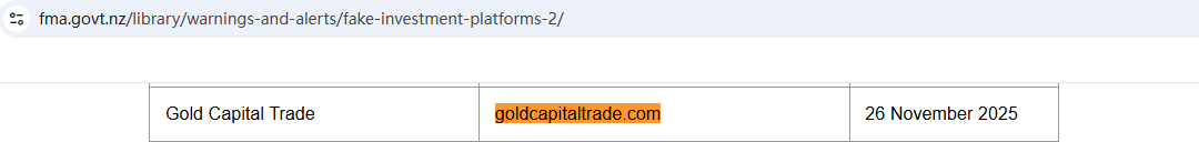 On Nov 26, 2025, the New Zealand Financial Markets Authority (NZ FMA) added Gold Capital Trade to its warning list, stating that this is a fake investment platform. https://www.fma.govt.nz/library/warnings-and-alerts/fake-investment-platforms-2/