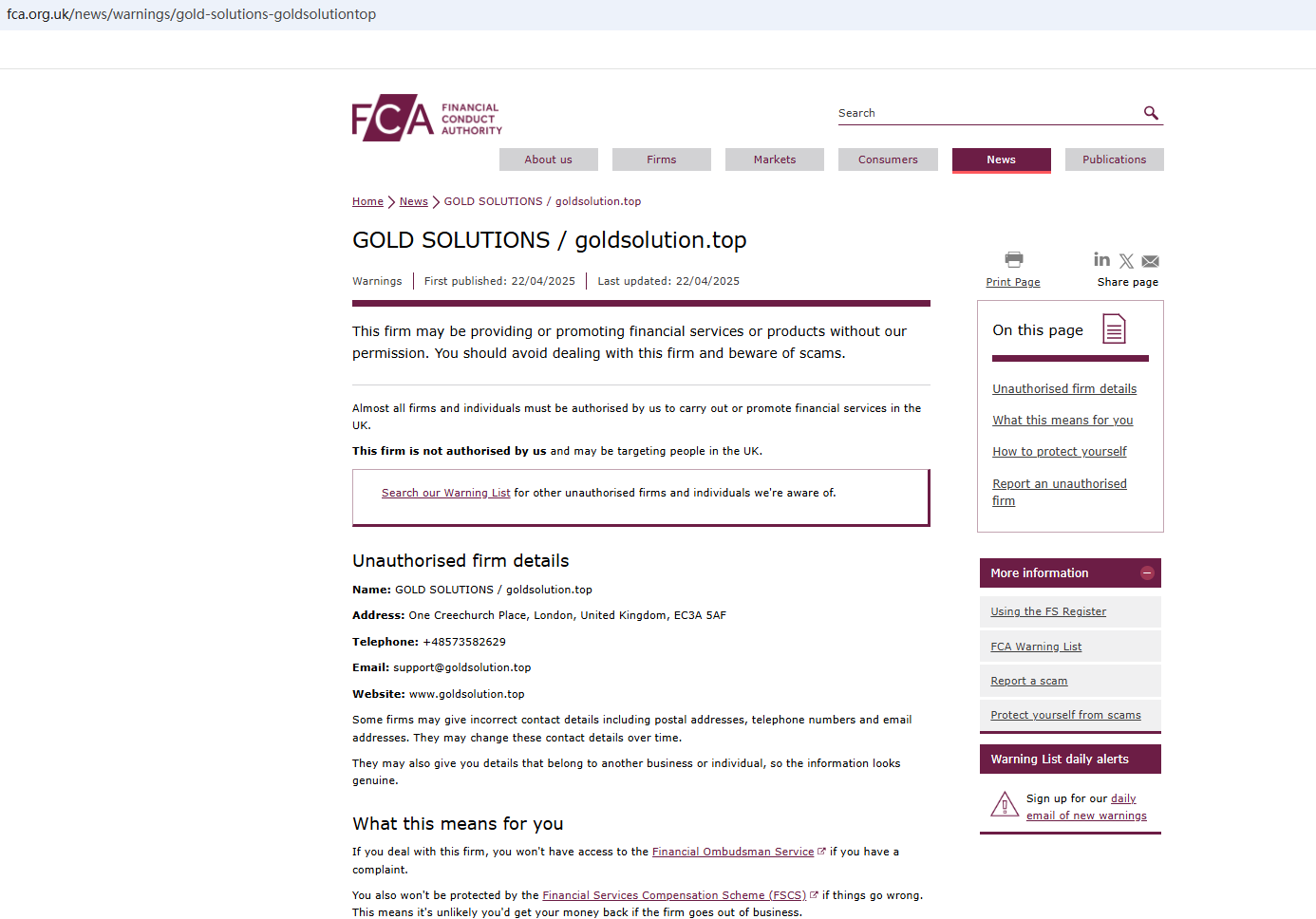It claims to be a reliable company and is regulated. However, there is no valid regulatory information displayed on the website for inquiry, not even an office address, which is very untrustworthy. In addition, the Financial Conduct Authority (FCA) issued a warning against Gold solutions, believing this company might be providing financial services or products without proper authorization in the UK.