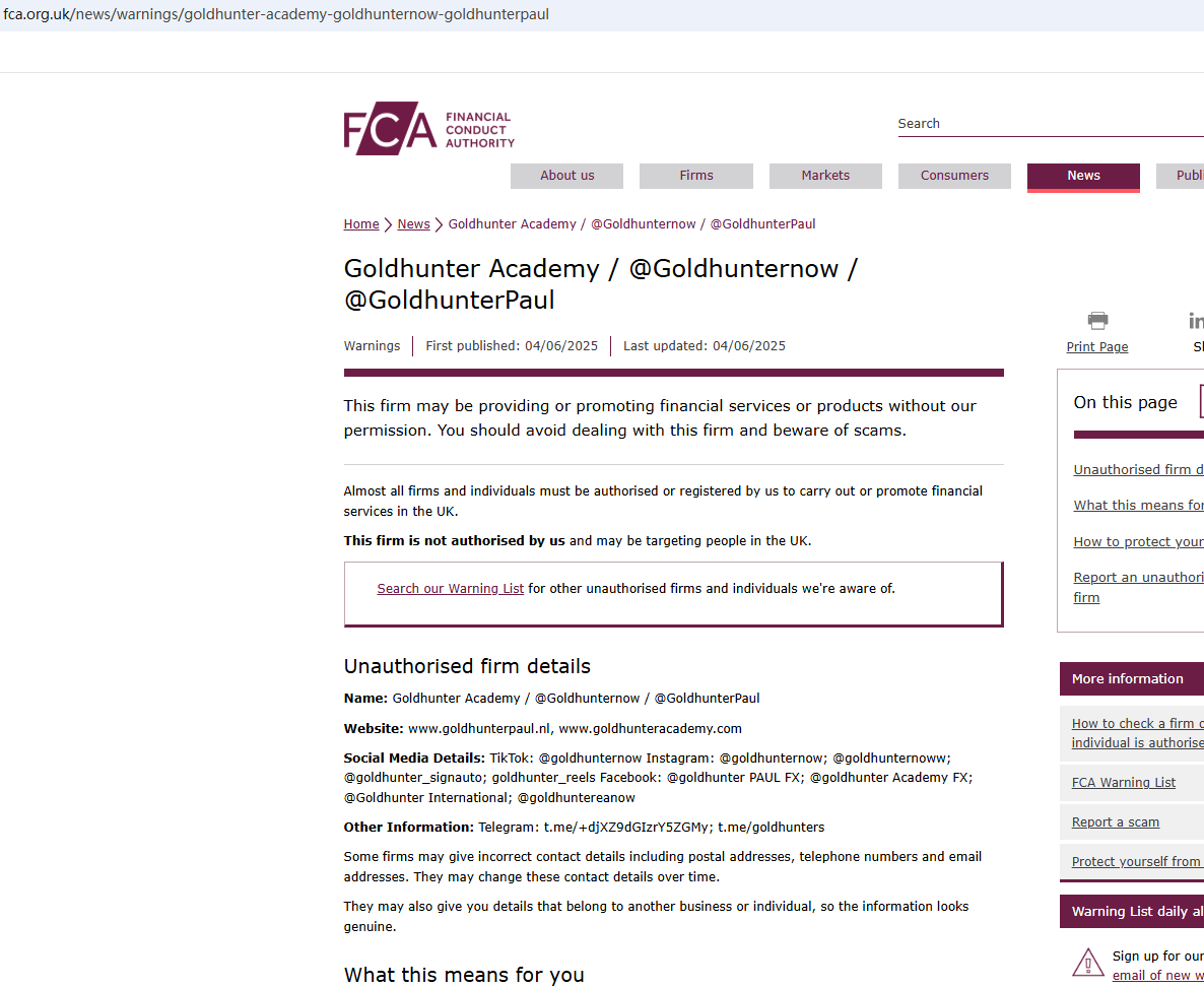 On Jun 4, 2025, the Financial Conduct Authority (FCA) issued a warning against Goldhunter Academy, believing this company might be providing financial services or products without proper authorization in the UK. https://www.fca.org.uk/news/warnings/goldhunter-academy-goldhunternow-goldhunterpaul