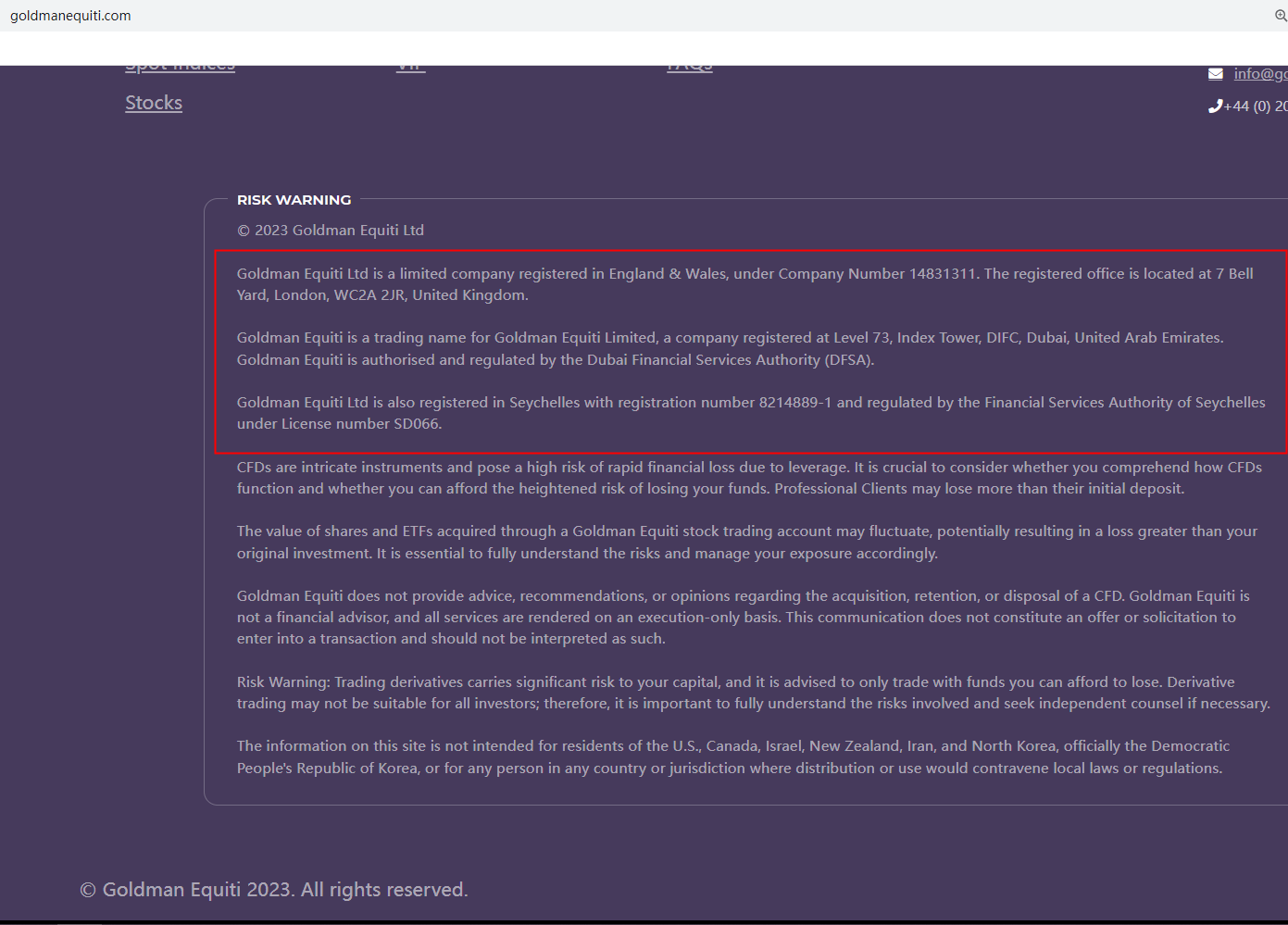 According to its website, it claims to be registered in England & Wales, under Company Number 14831311. While we found the matching information in the Companies House (CH), Financial Conduct Authority (FCA) has no relevant information. Without FCA authorization, just registering with CH is meaningless, as the registrar has no authority to supervise foreign exchange. In addition, it claims to be regulated by DuBai Financial Services Authority (DFSA) and Seychelles Financial Services Authority (Seychelles FSA), but there is no matching information found in these regulators.The truth is that Goldman Equiti is not regulated by any regulators. Letting it hold or control investors' money is unsafe, and the money can not be protected by any laws.Goldman Equiti is a scam.