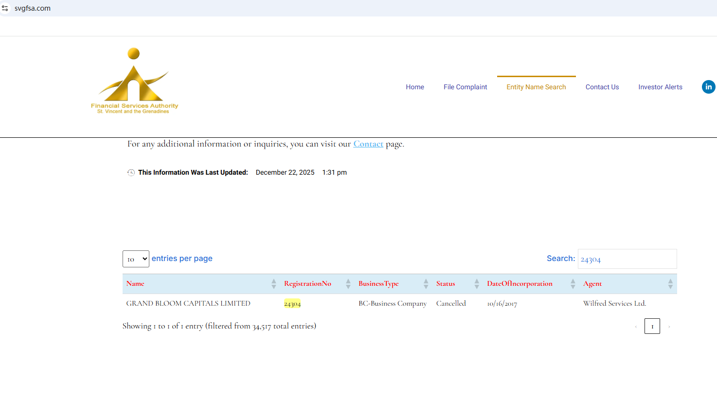 The website of Grand Bloom is currently unavailable. The claimed registration with the Financial Services Authority of St. Vincent and The Grenadines (SVG FSA) has been canceled as well. All the signs indicate substantial risks of Grand Bloom. Investors should be informed about the development and stay clear of it.