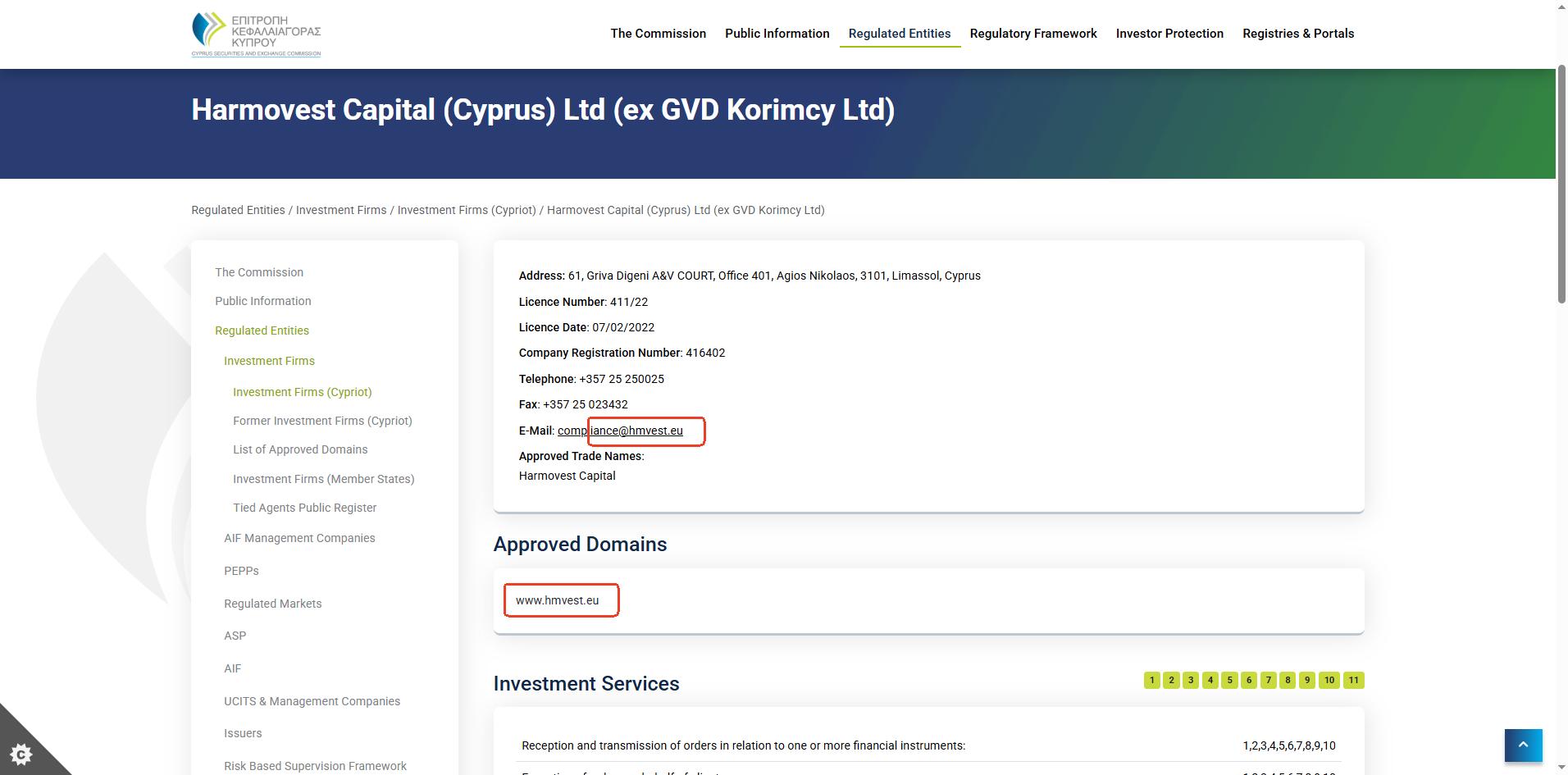 the CySEC-registered "Harmovest Capital (Cyprus) Ltd" lists only hamovest.eu, not the platform’s actual site, hamovest.com, with no disclosed affiliation;