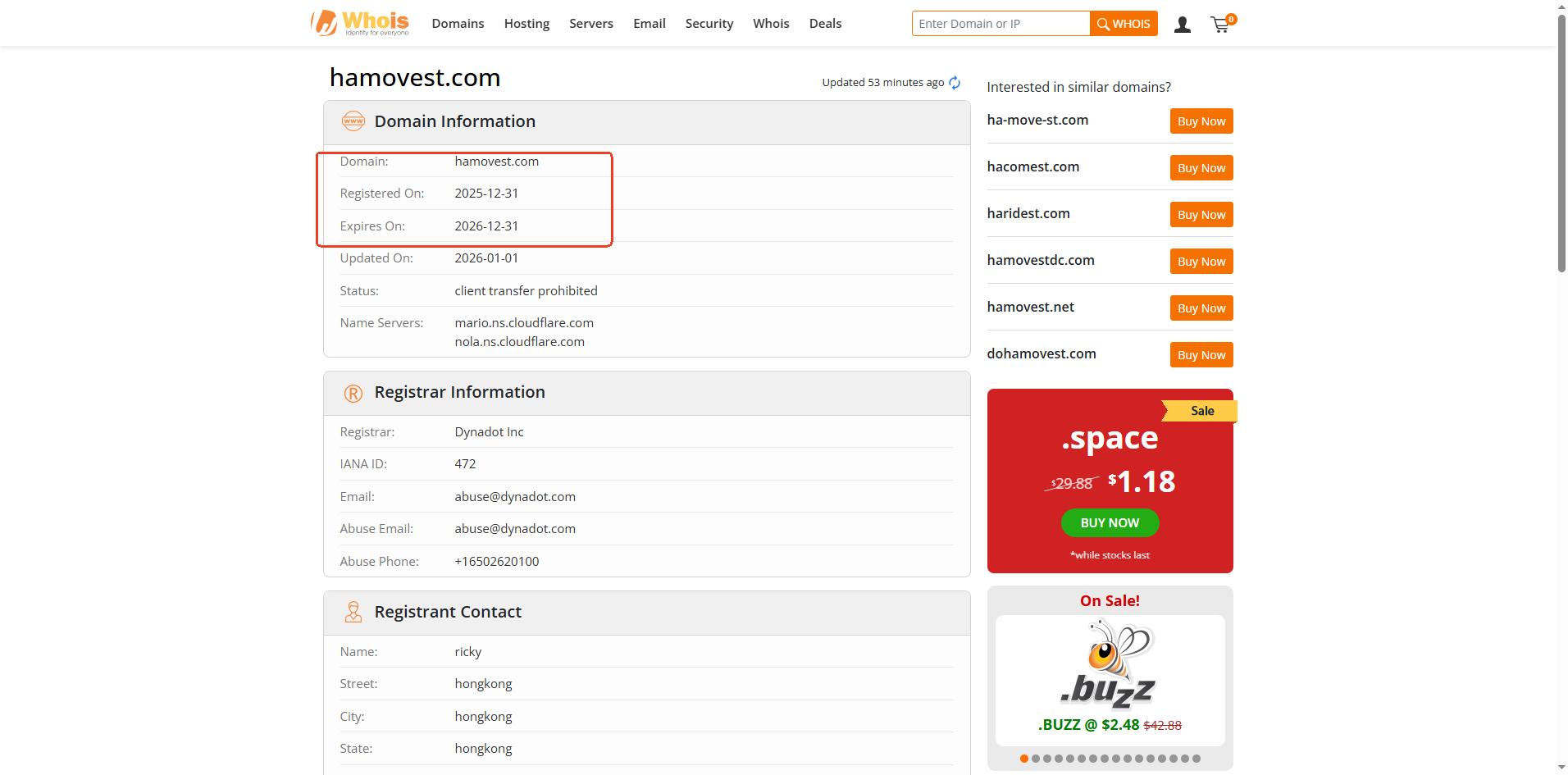 Adding to concerns, public records show the hamovest.com domain was registered on December 31, 2025, an anomalous future date that further undermines credibility.