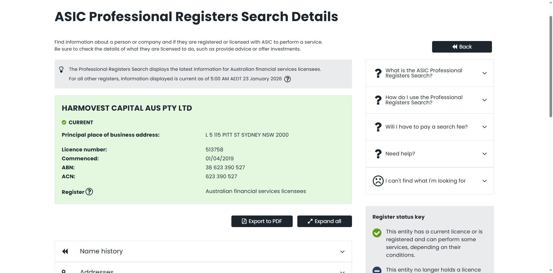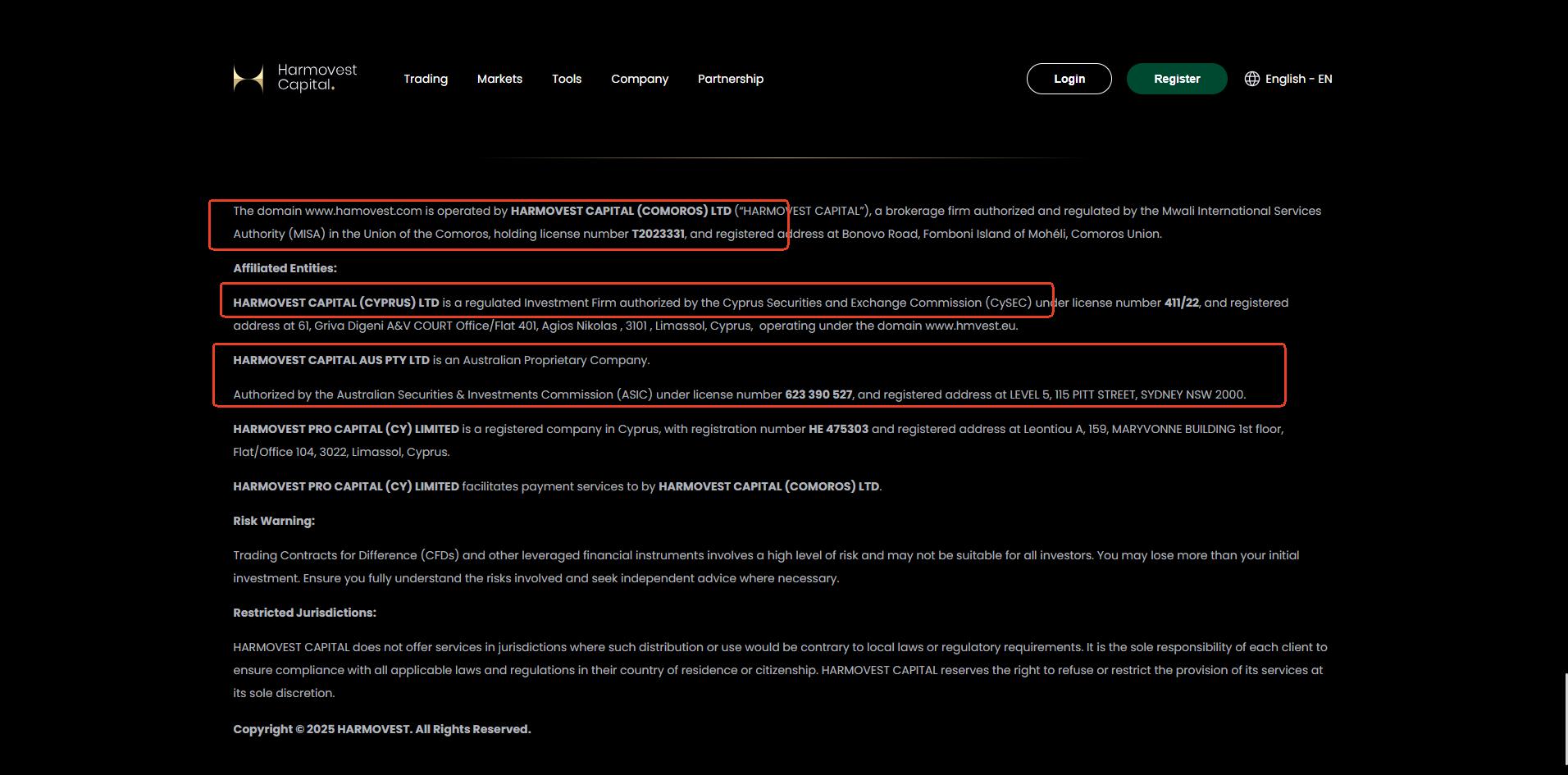 Harmovest Capital claims regulation across three jurisdictions, but our investigation reveals significant inconsistencies: its asserted MISA license (No. T2023331) corresponds to a different entity with an unrelated domain;
