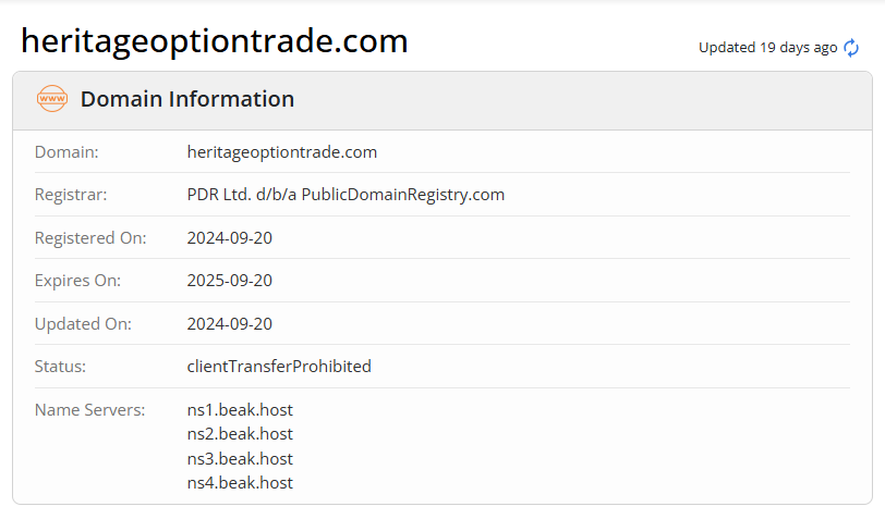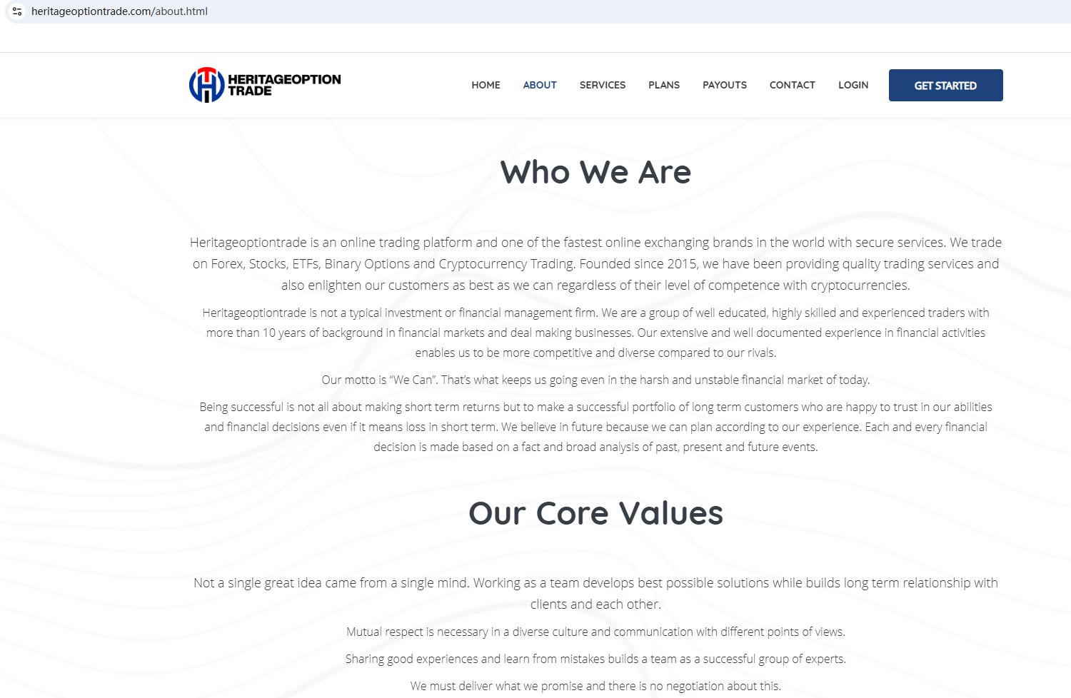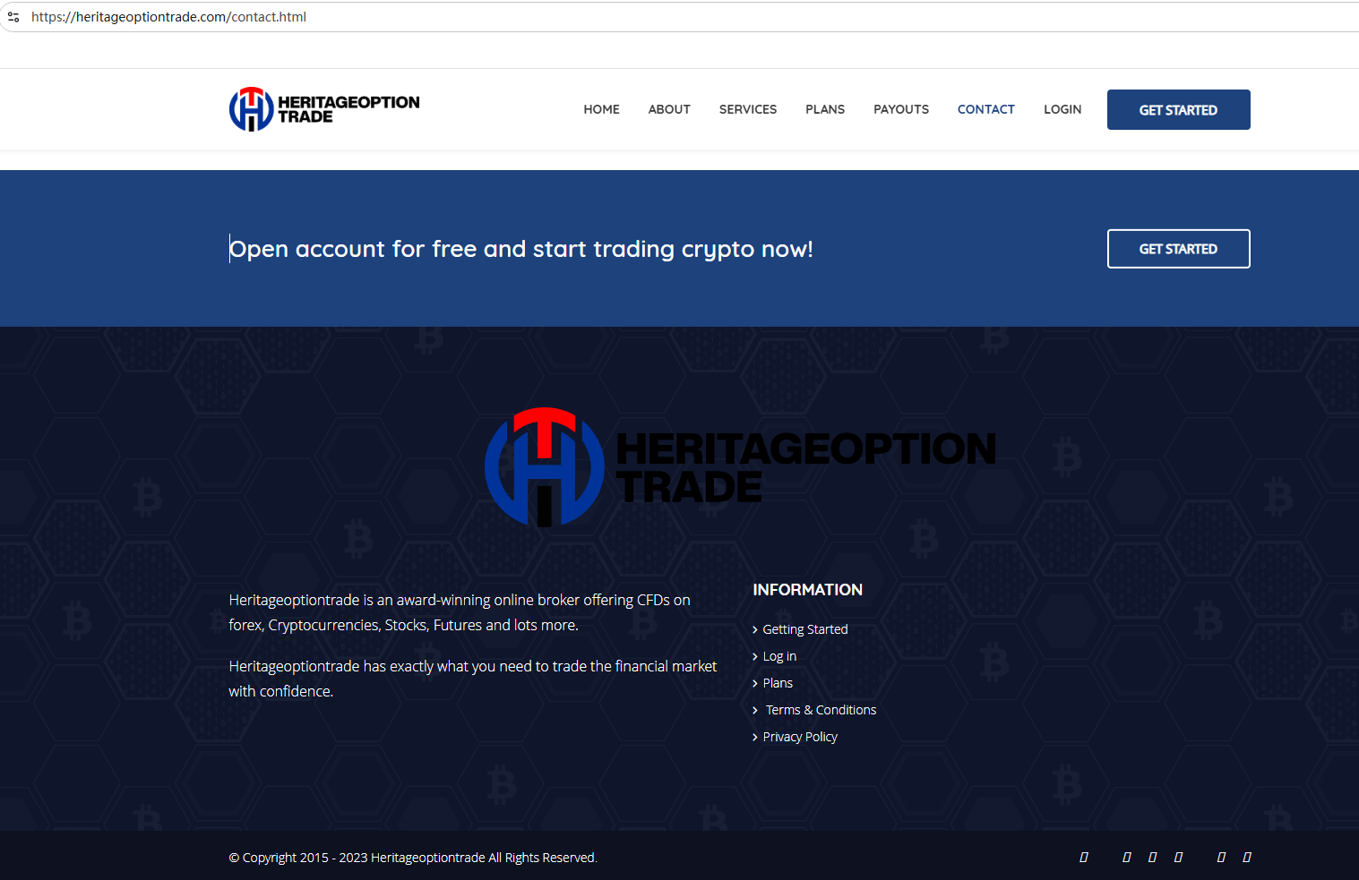 According to its website, it was established in 2015 and claims to be a reliable company. Upon investigation, we found that its domain name was not established until 2024, which shows that this statement is unreliable. The website does not display any valid regulatory information. Investors are advised to be careful and do not deposit money here.In essence, Heritageoptiontrade is not regulated by any governing body. Entrusting it with investors' funds is highly risky, as there are no legal protections in place to safeguard the funds.Heritageoptiontrade appears to be a scam.