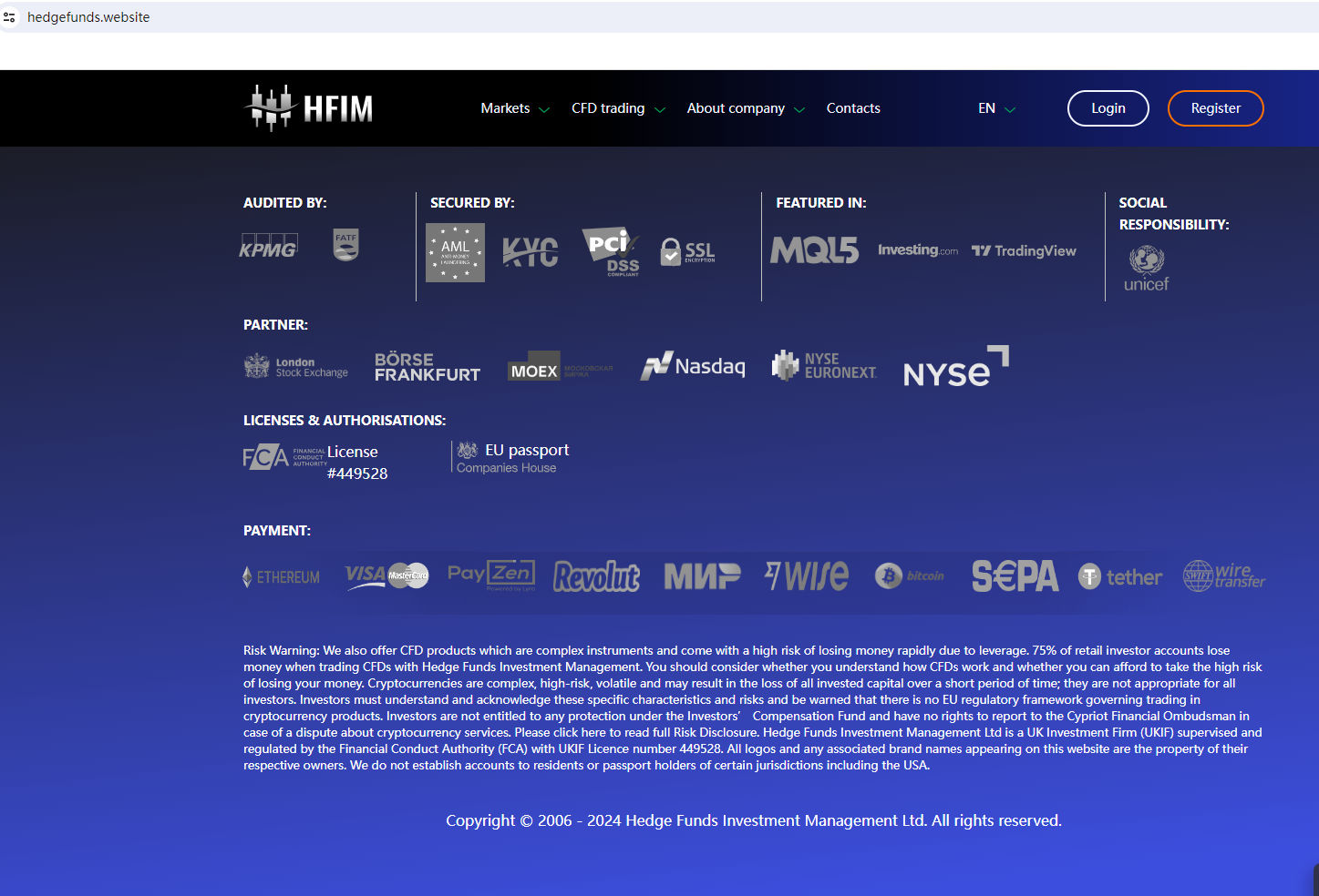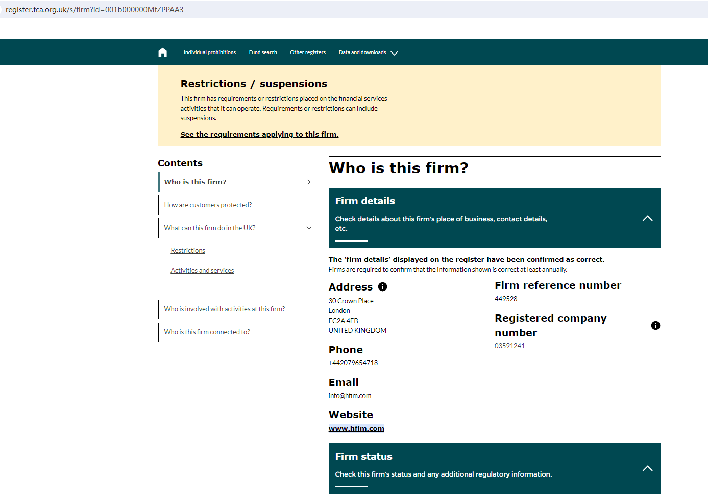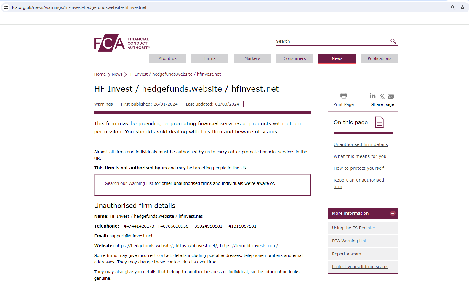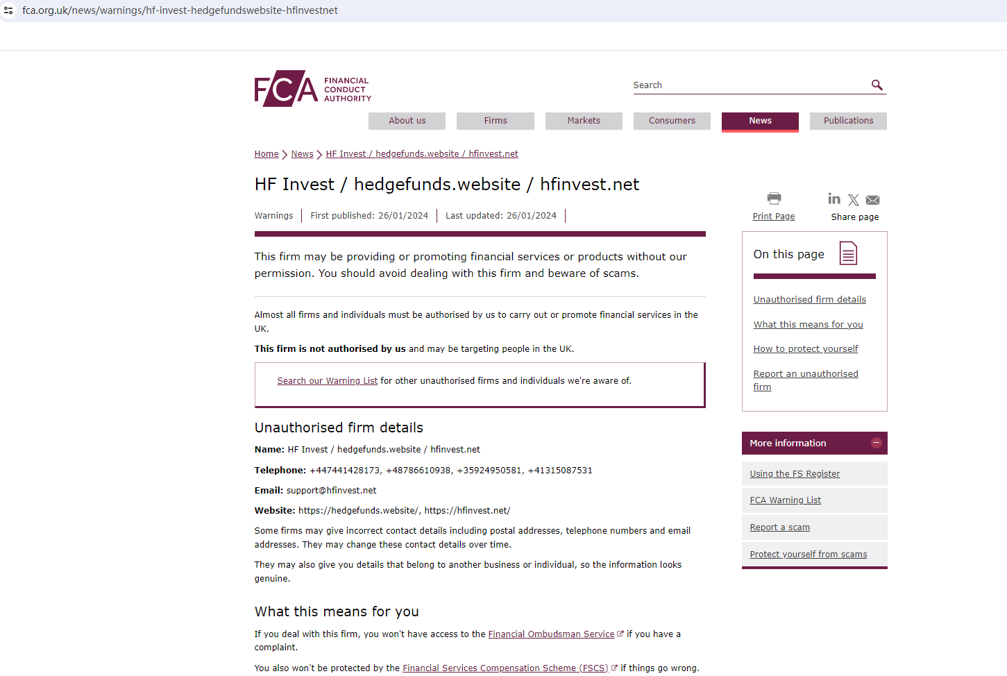 In addition, the Financial Conduct Authority (FCA) issued a warning against HF Invest (https://hedgefunds.website/&https://hfinvest.net/), believing this company might be providing financial services or products without proper authorization in the UK.