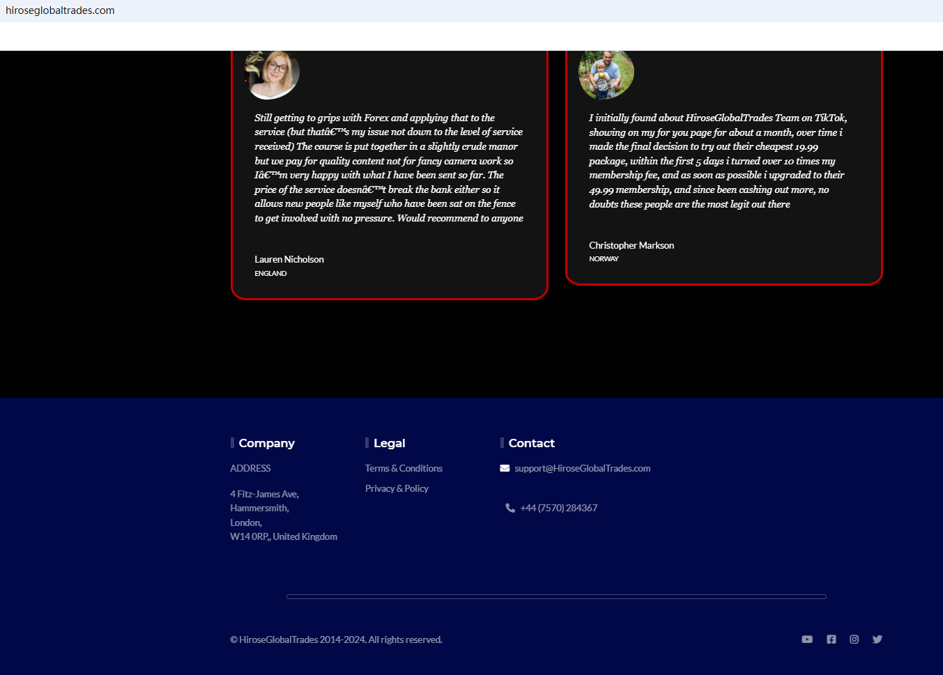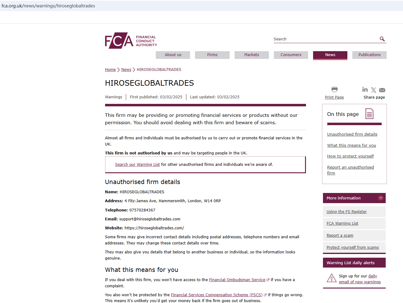 In addition, its address is located in the UK, but we found that the Financial Conduct Authority (FCA) issued a warning against HIROSEGLOBALTRADES, believing this company might be providing financial services or products without proper authorization in the UK.