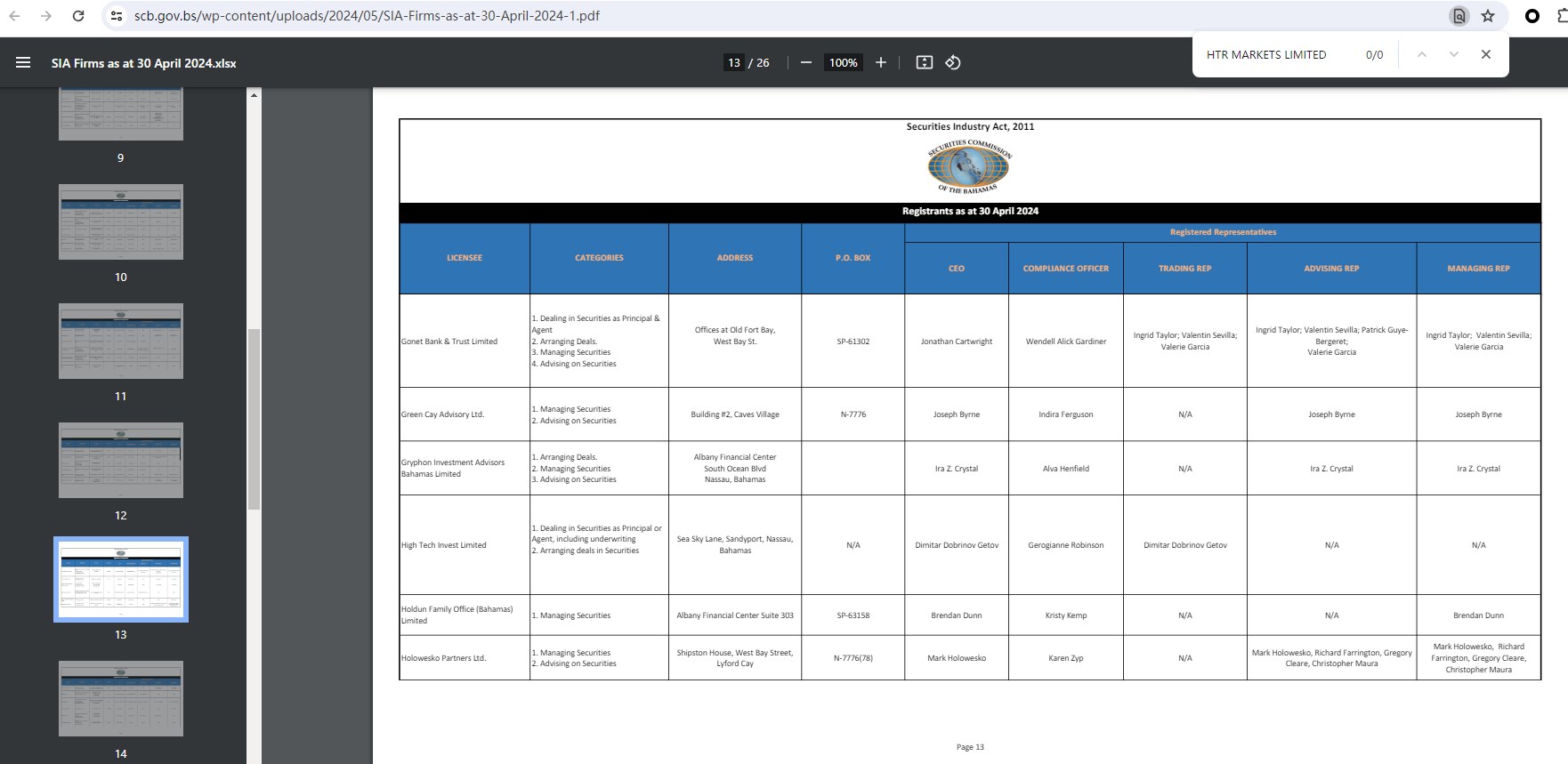 Upon investigation, we found that HTR Markets Limited is not regulated by the SCB.
