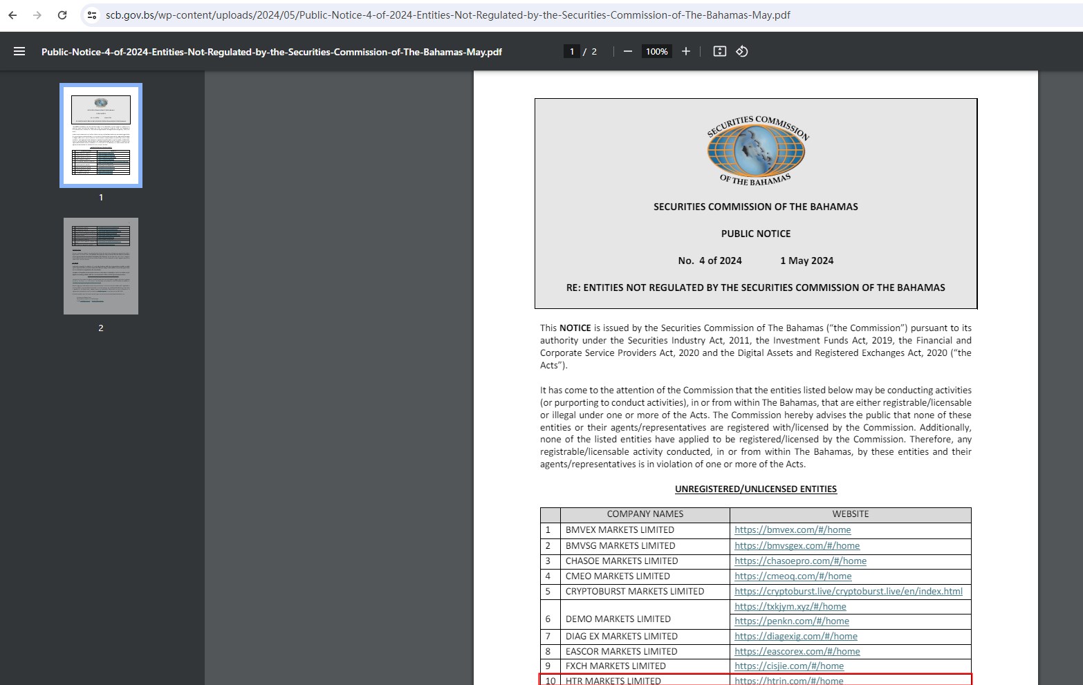 And the SCB issued a warning that HTR Markets Limited (https://htrin.com/#/home) was providing financial services or products without authorisation.