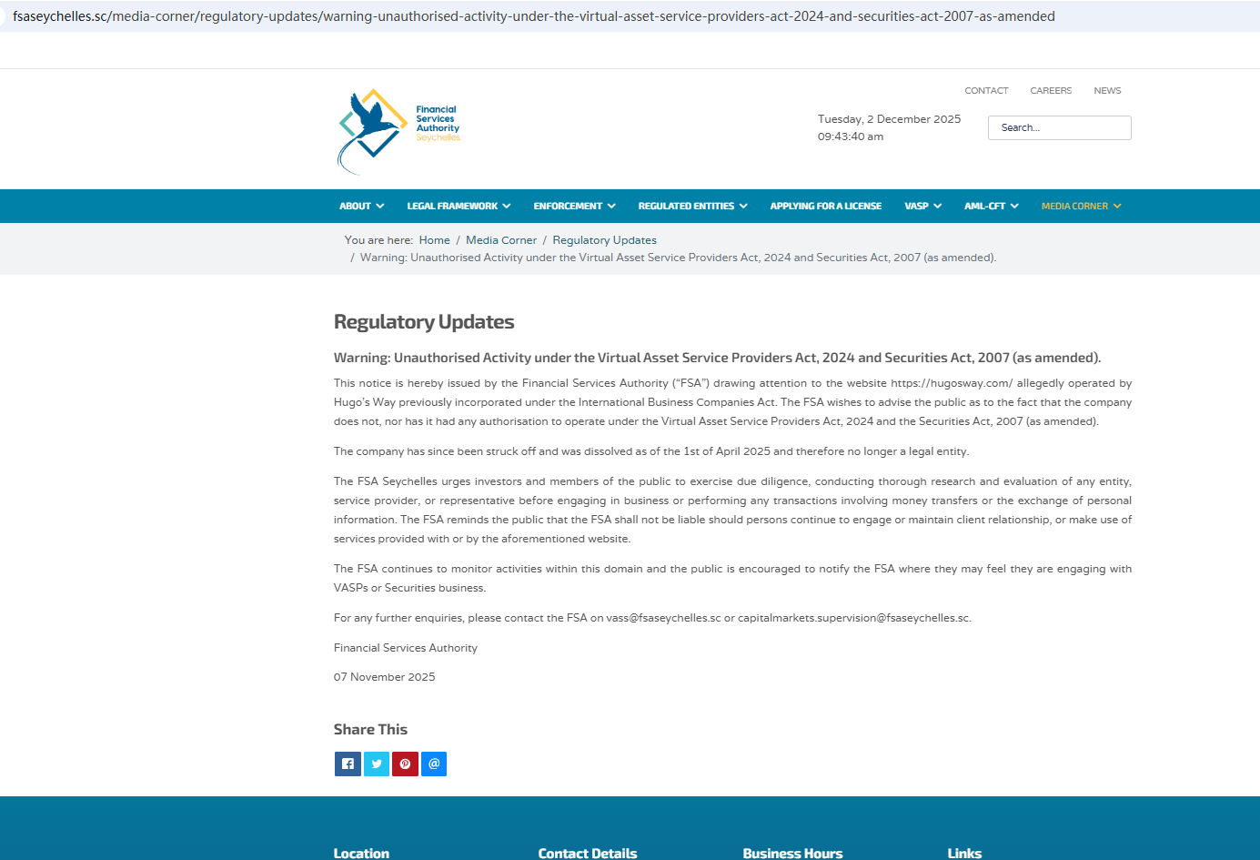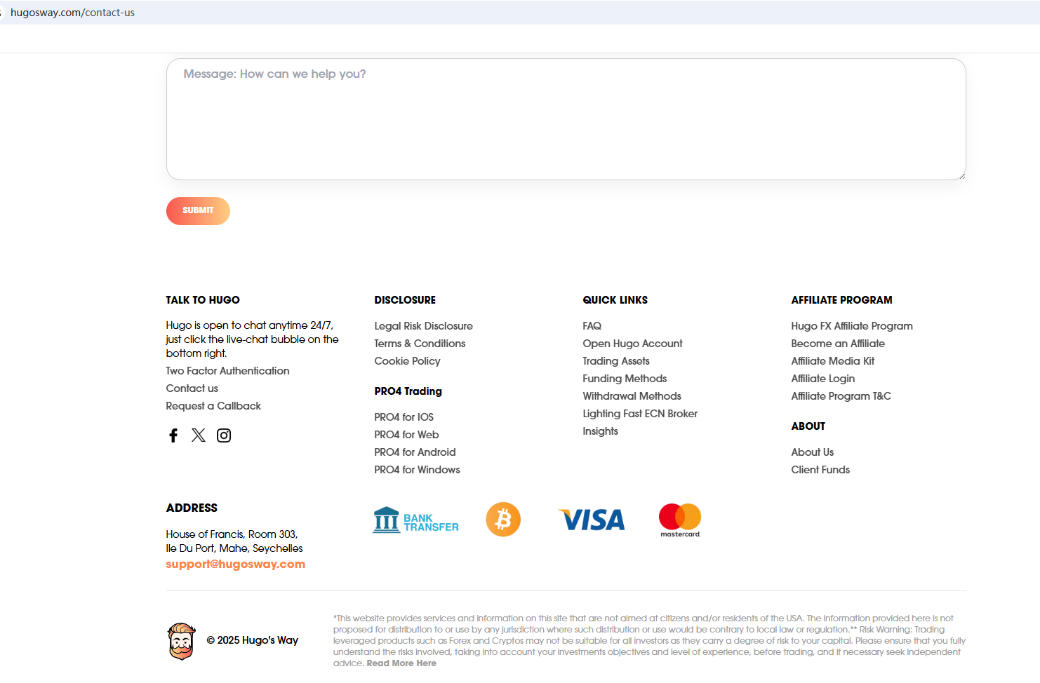 The company currently claims to be based in Seychelles, however, Hugo’s Way Ltd. is not listed as a licensed entity by the Seychelles Financial Services Authority (FSA), indicating that it operates without authorization in this jurisdiction.