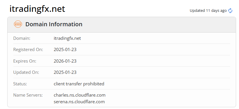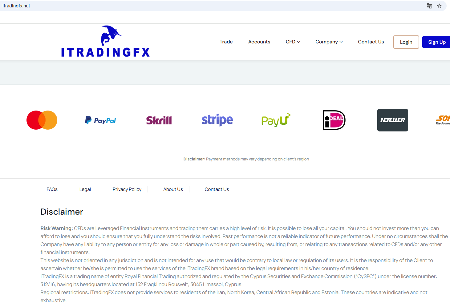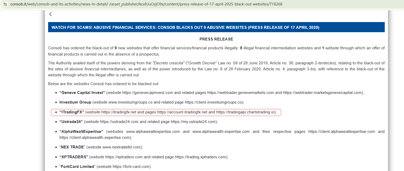 It claims to be regulated by the Cyprus Securities and Exchange Commission (CySEC) with a regulatory number of 312/16. Upon investigation, we found that the broker website on file with CySEC is inconsistent with iTradingFx, and the domain name of iTradingFx was not established until January 2025. The regulatory information of a compliant company was stolen. The funny thing is that the Cyprus Securities and Exchange Commission (CySEC) issued a warning against iTradingFX, believing this company might be providing financial services or products without authorisation.