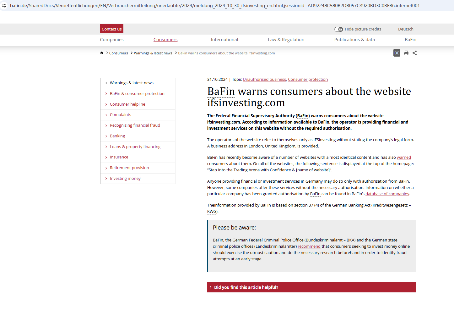 In addition, the Federal Financial Supervisory Authority (BaFin) warned consumers about the services offered by the company IFSinvesting (ifsinvesting.com), which offers financial and investment services without the required authorization.