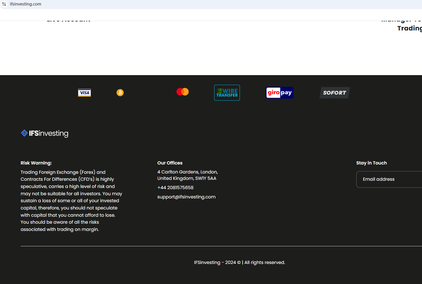 According to its website, it is located in the UK. Upon investigation, no matching information was found in the Financial Conduct Authority (FCA).In addition, the Federal Financial Supervisory Authority (BaFin) warned consumers about the services offered by the company IFSinvesting (ifsinvesting.com), which offers financial and investment services without the required authorization.In essence, IFSinvesting is not regulated by any governing body. Entrusting it with investors' funds is highly risky, as there are no legal protections in place to safeguard the funds.IFSinvesting appears to be a scam.