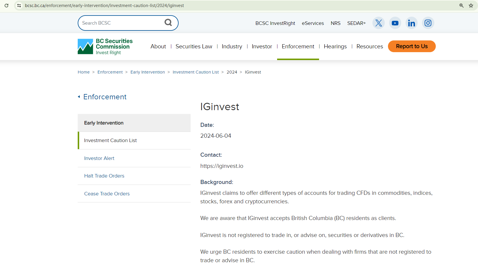 Adding to the concerns, the British Columbia Securities Commission (BCSC) issued a warning against IGinvest, stating that this broker is not registered to trade in, or advise on, securities or derivatives in BC.